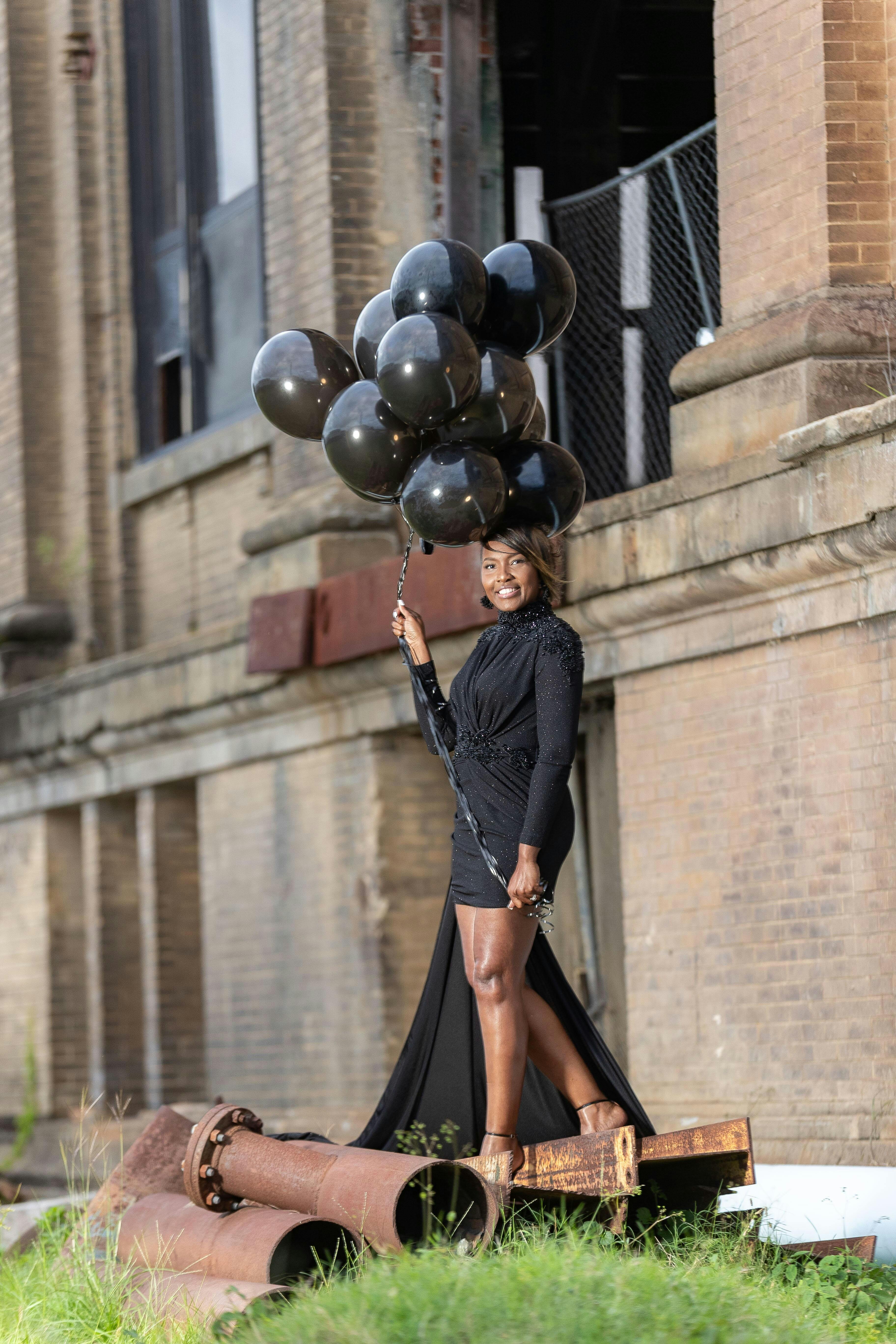 Description: Short dress with side tail, high neck, embroidered with black shiny beads.