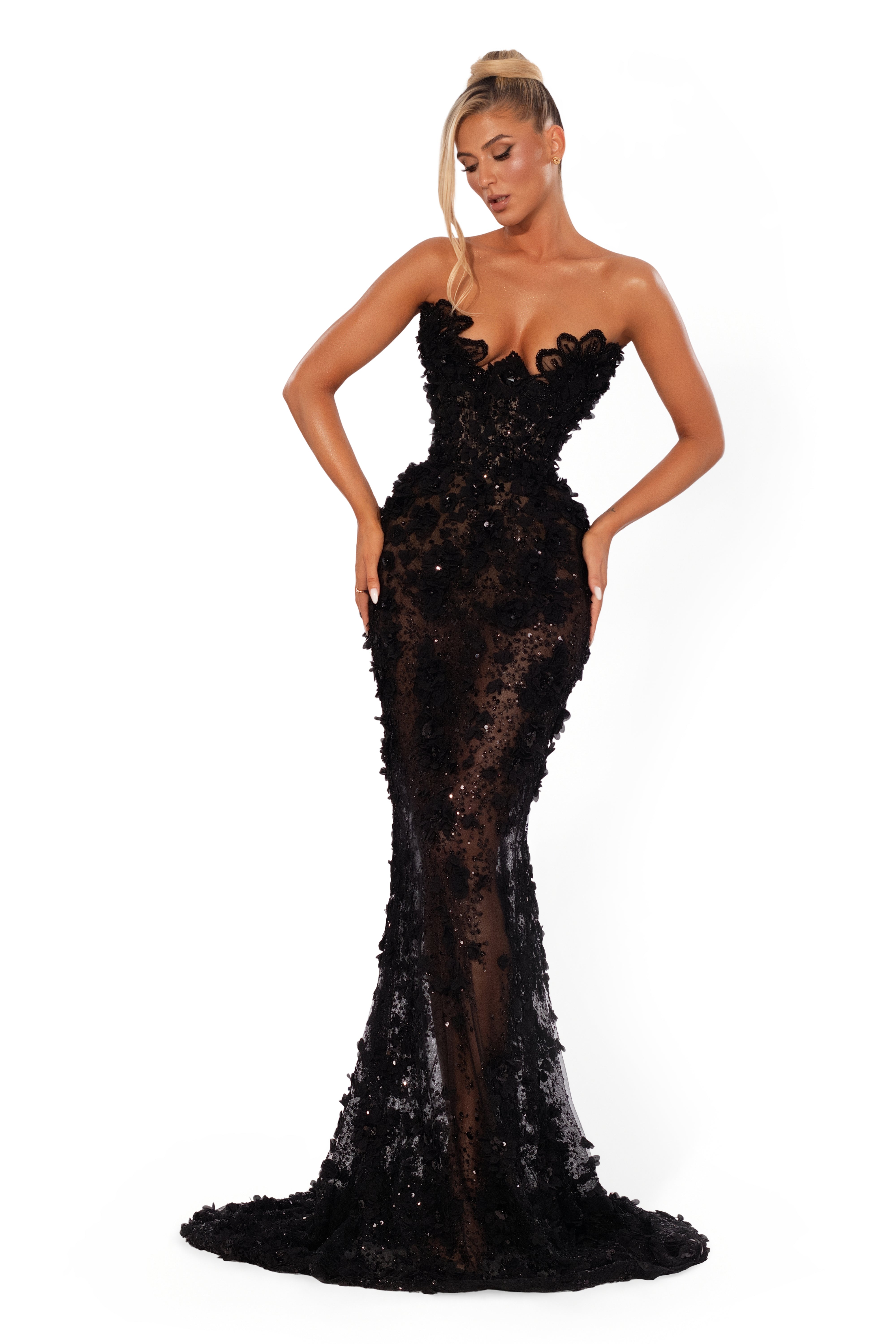 • Sheer mermaid silhouette with black florals