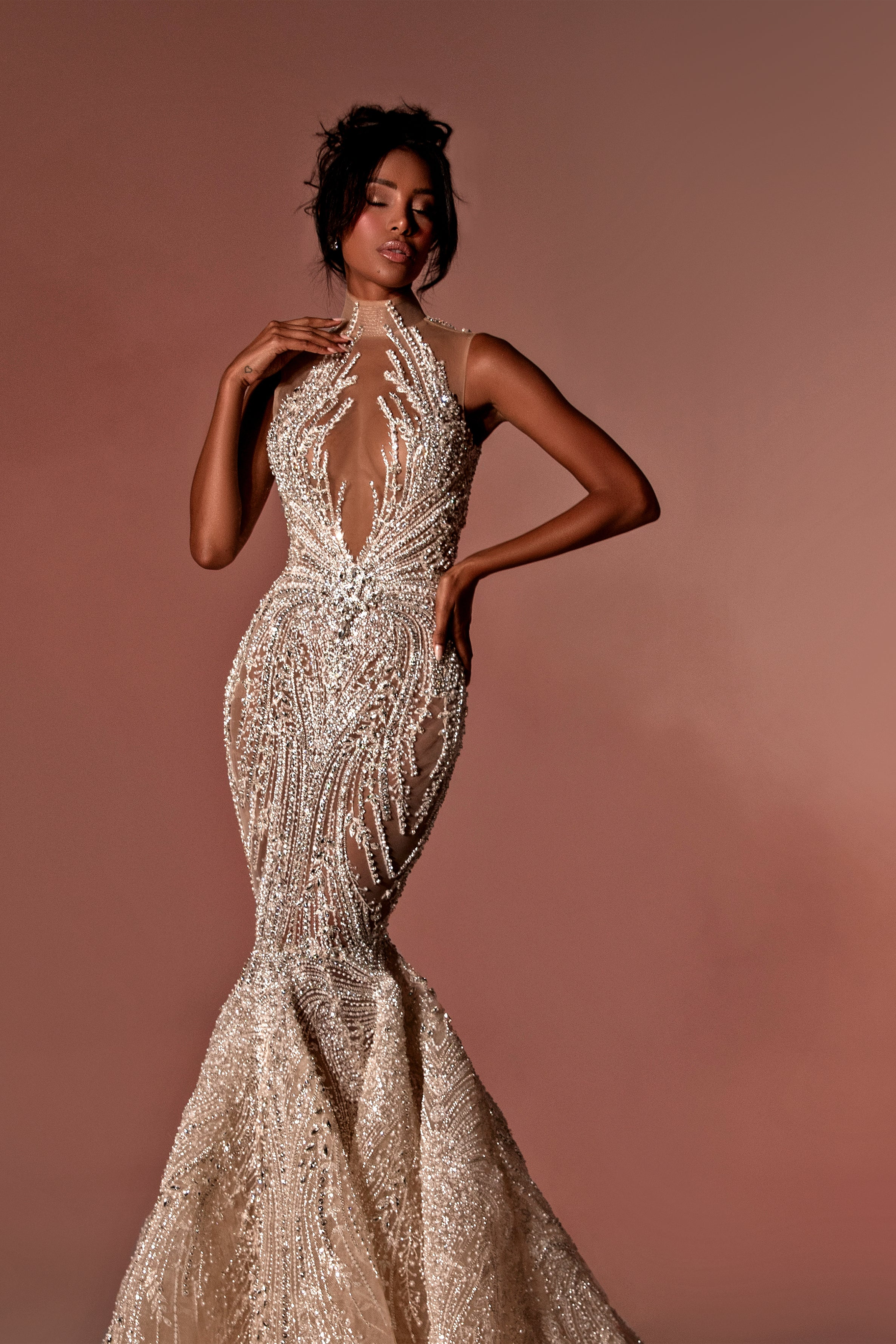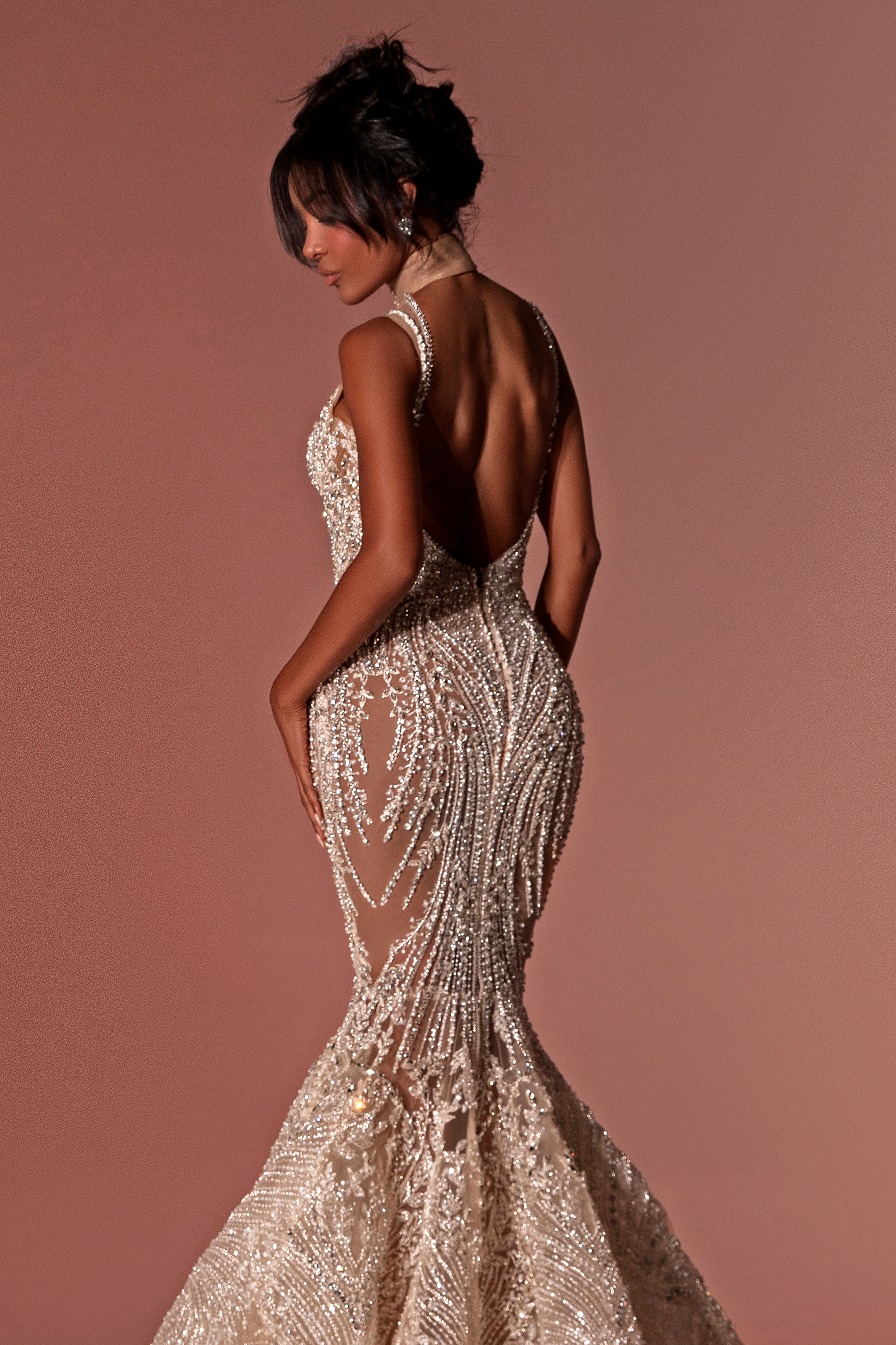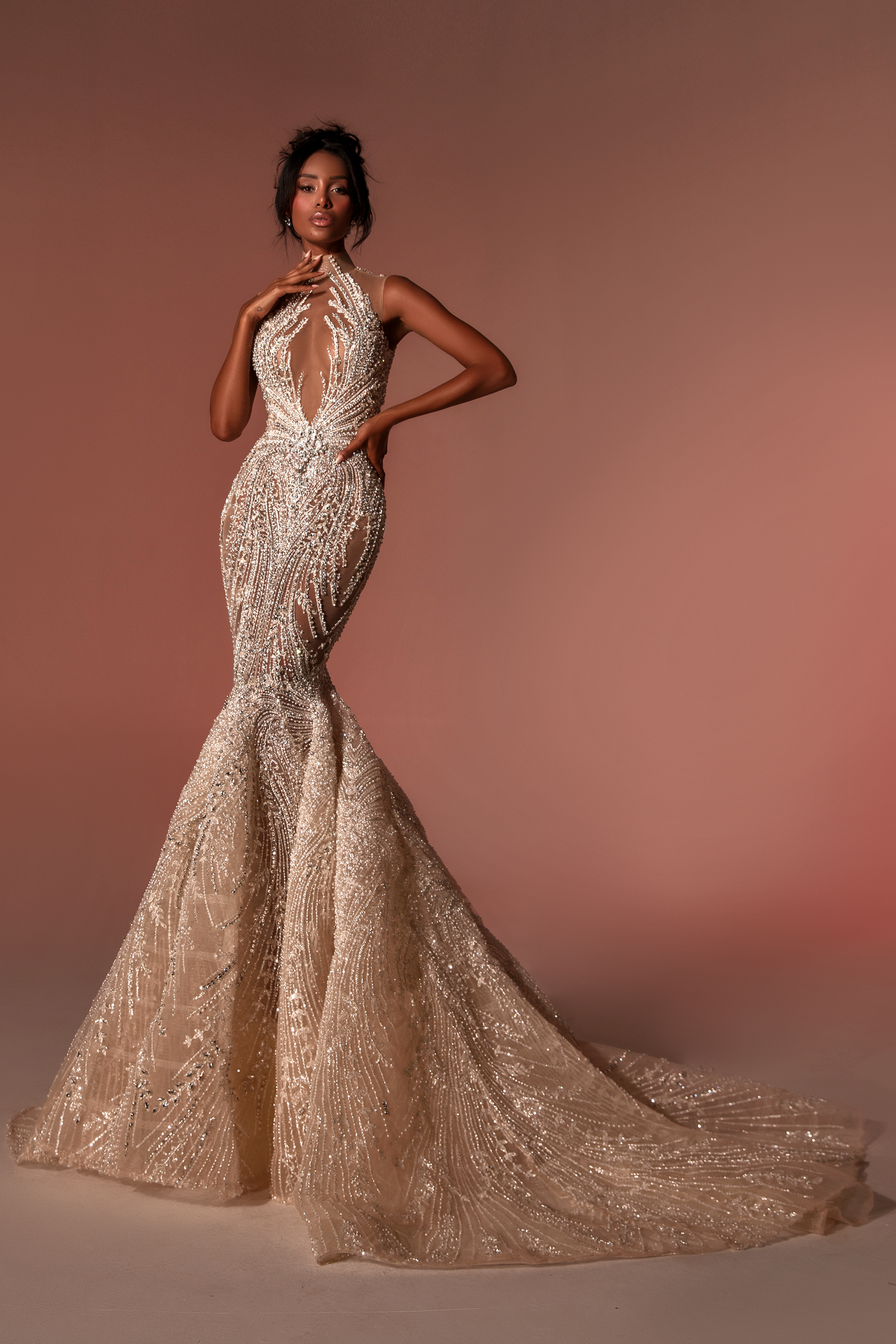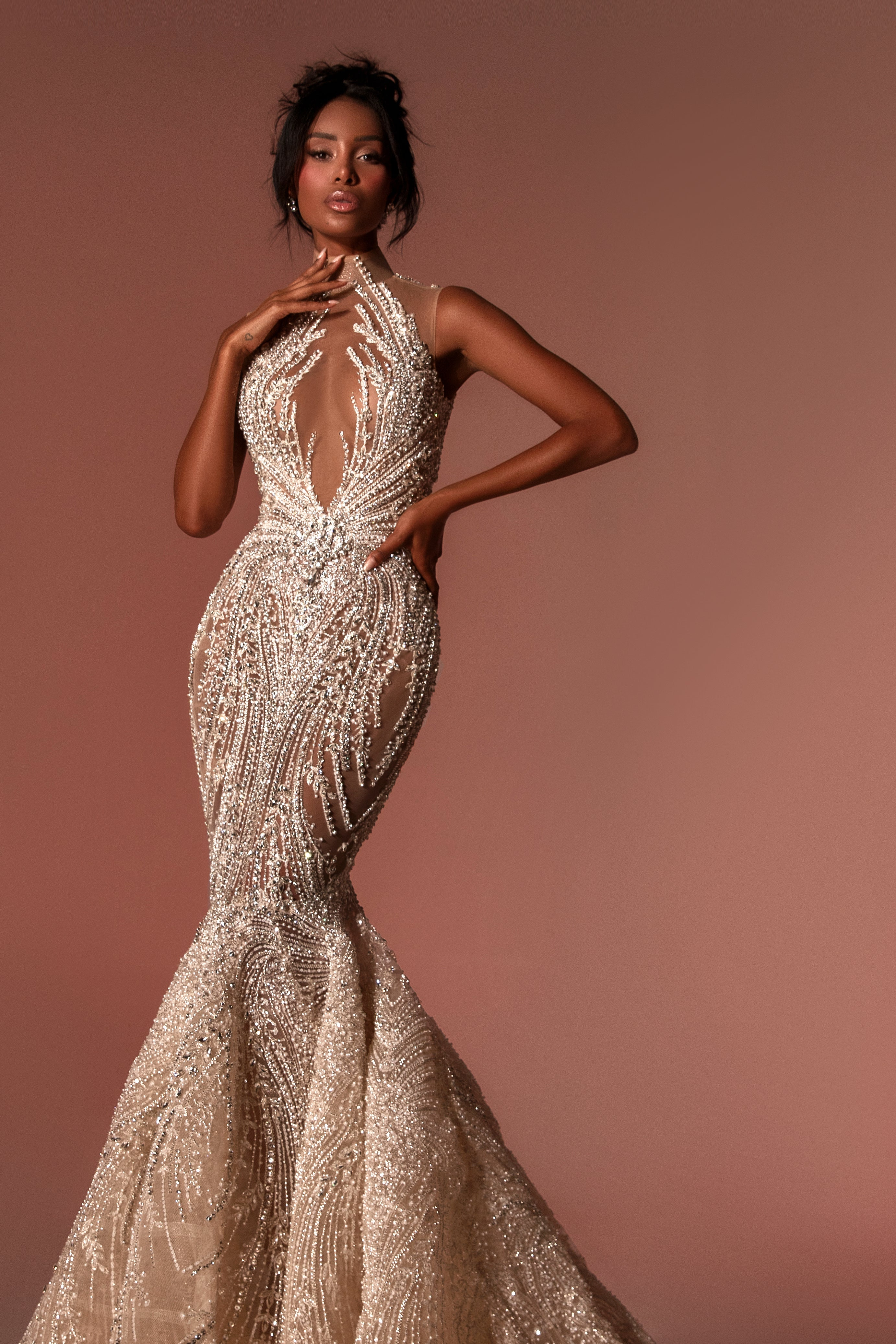 Mermaid high neck dress with long tail decorated in front of the embroidered pearl and