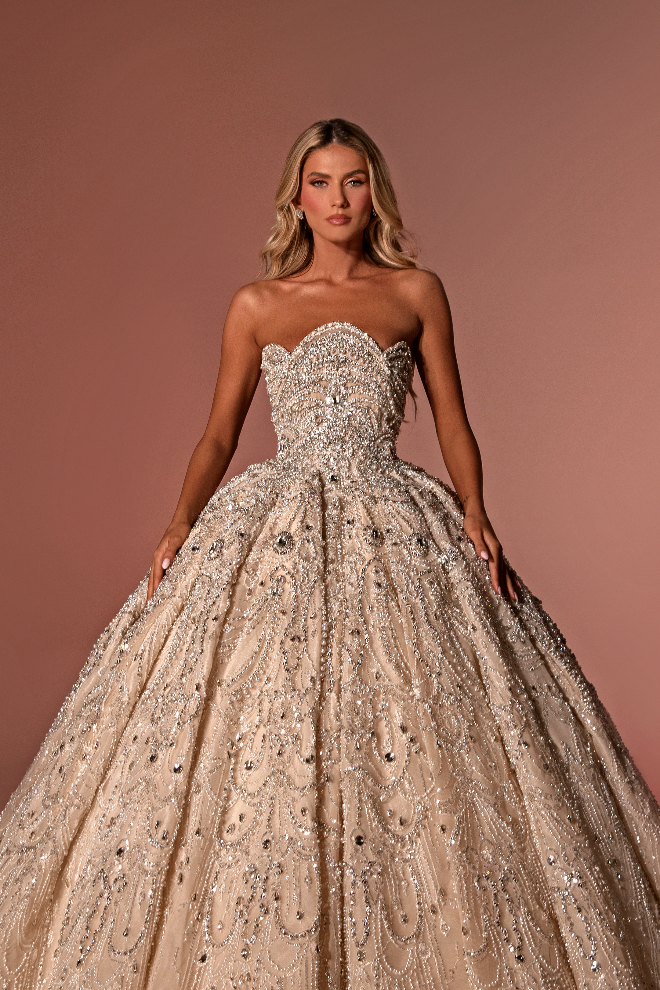A fitted and fashionable off-the-shoulder Dress with crystal sleeves featuring mermaid sweep train embellished all in stones.