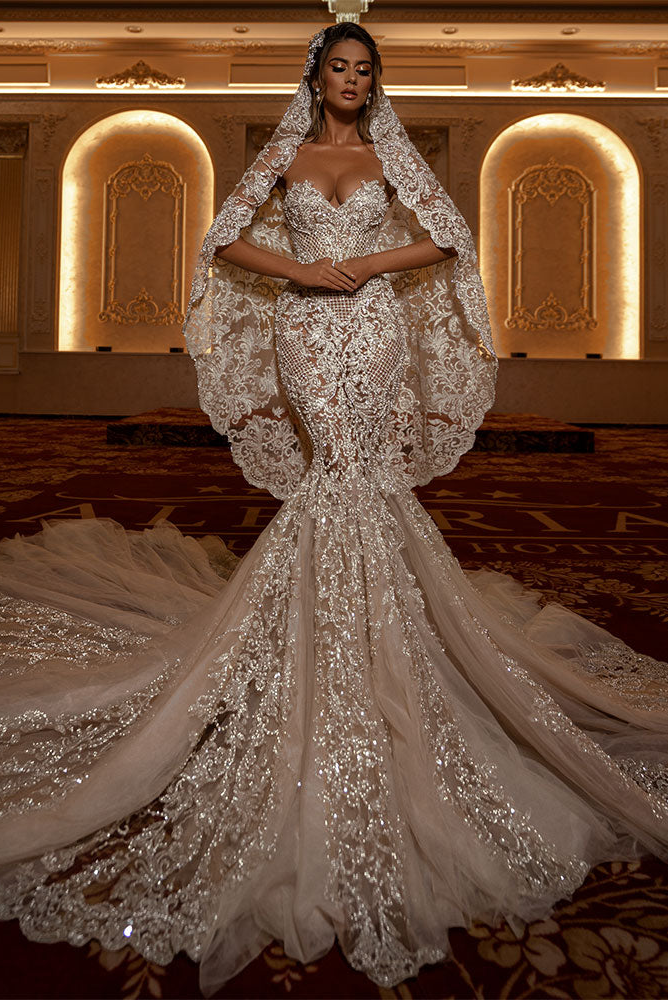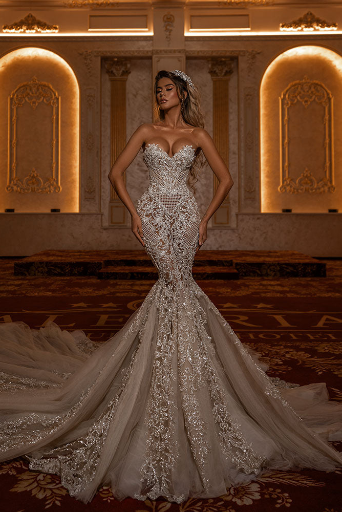 Description: Mermaid corset dress with long tulle train decorated in hand embroidered pearl and crystals.