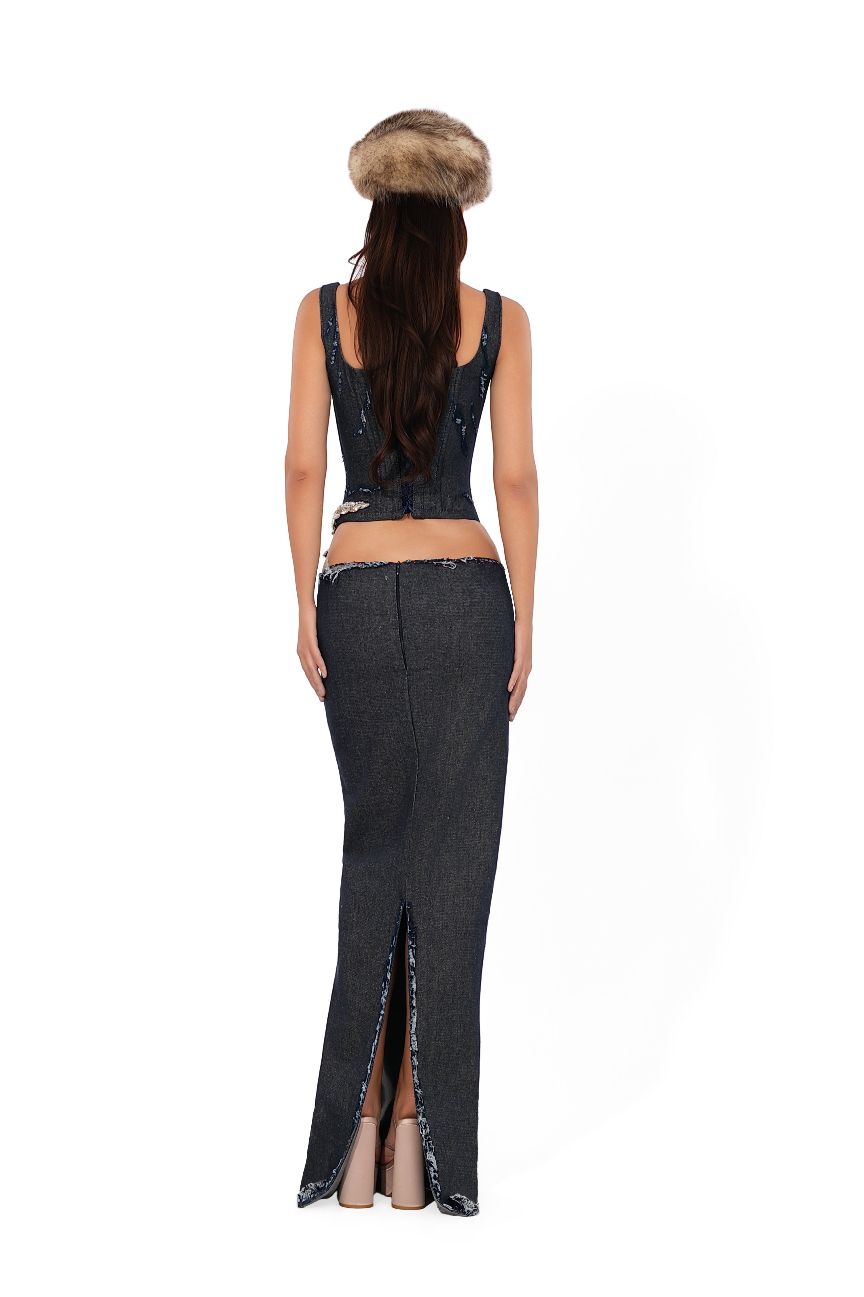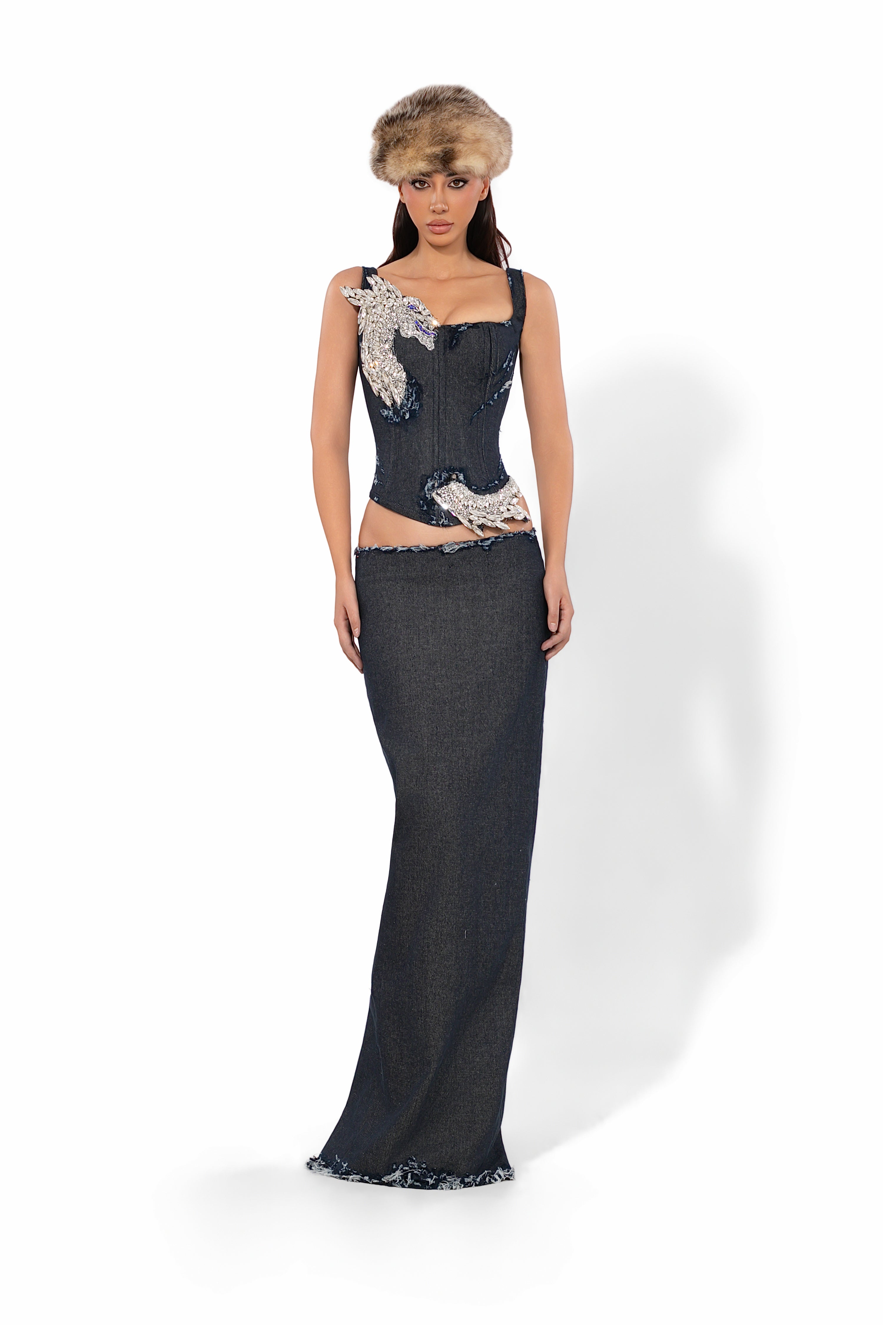 DECORATION: Machine-applied crystal and bead embellishments with linear and scattered arrangements