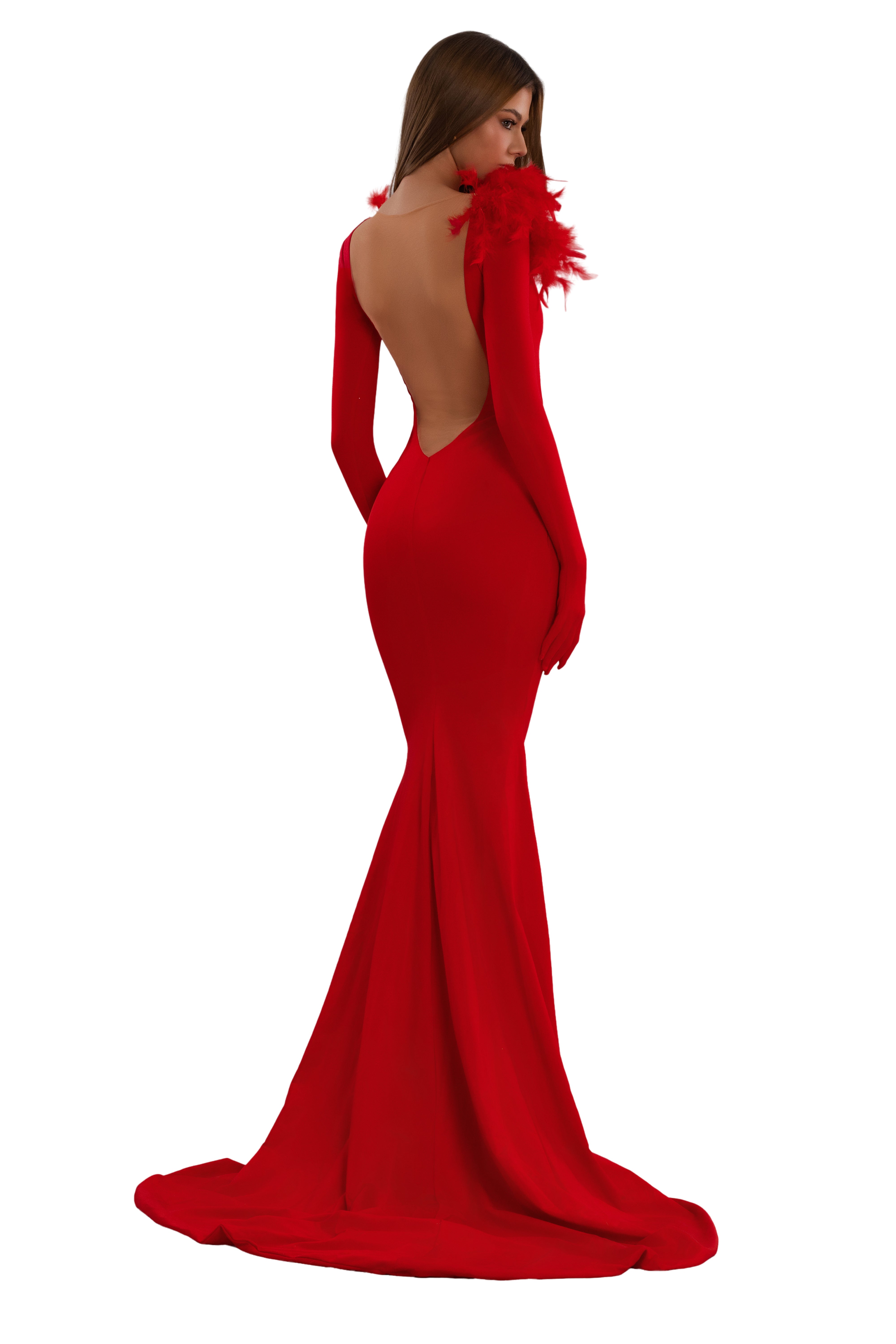 Long-sleeved bodycon silhouette with dramatic feathered neckline