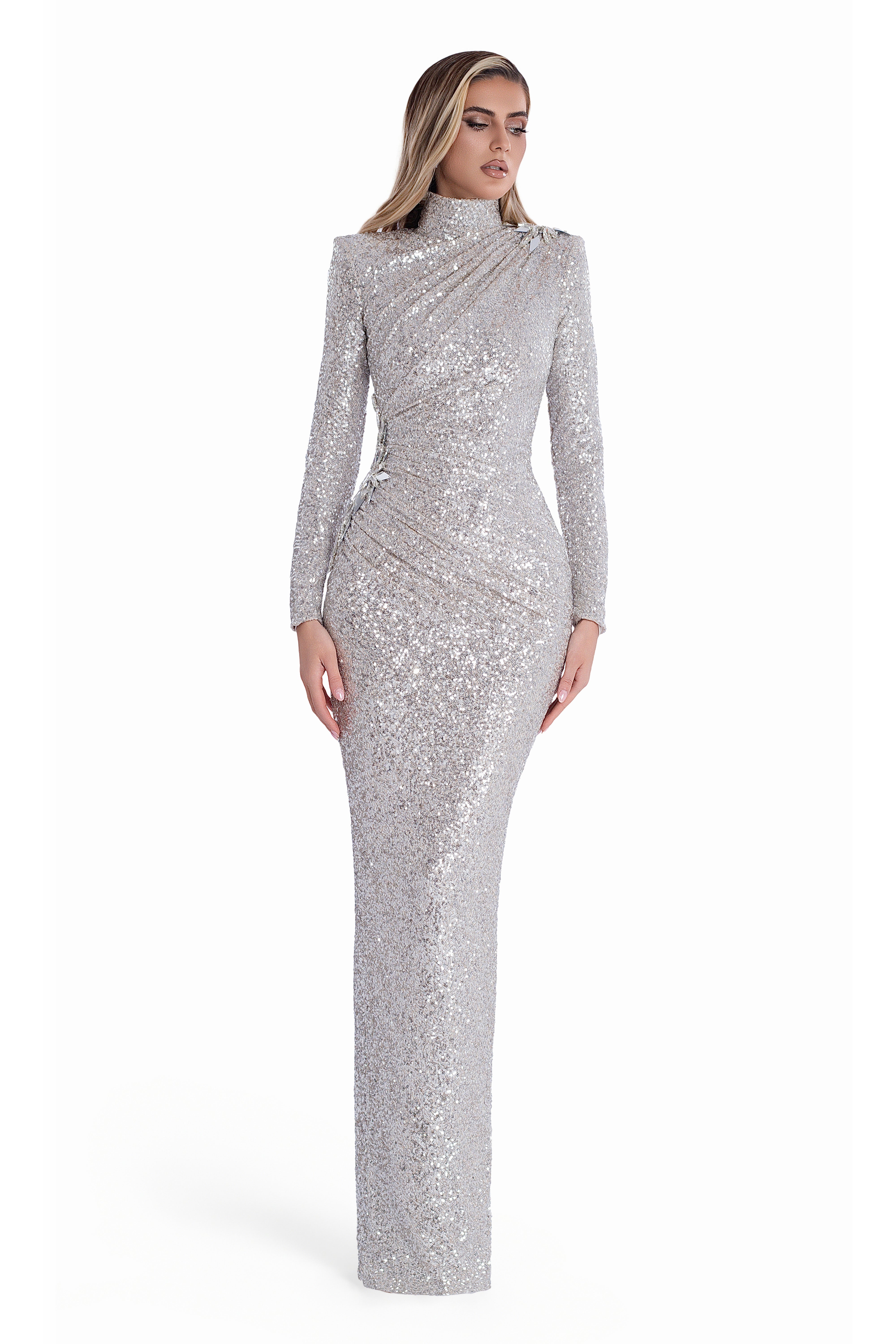 Fully sequined, figure-flattering silhouette.