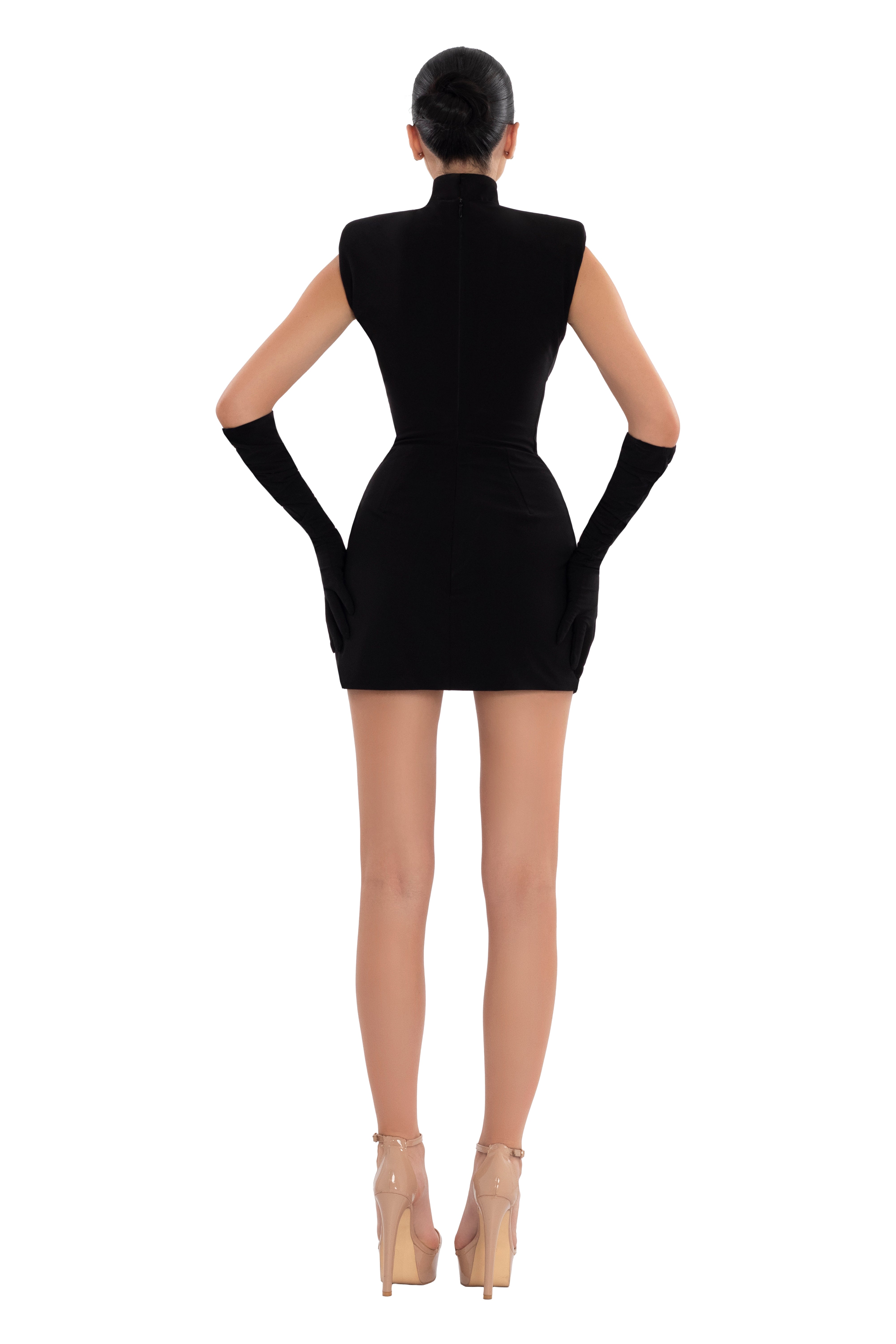 Black mini dress showcases a striking red lips design on the bodice. The high neck and draped skirt with a thigh-high slit add a touch of sophistication.