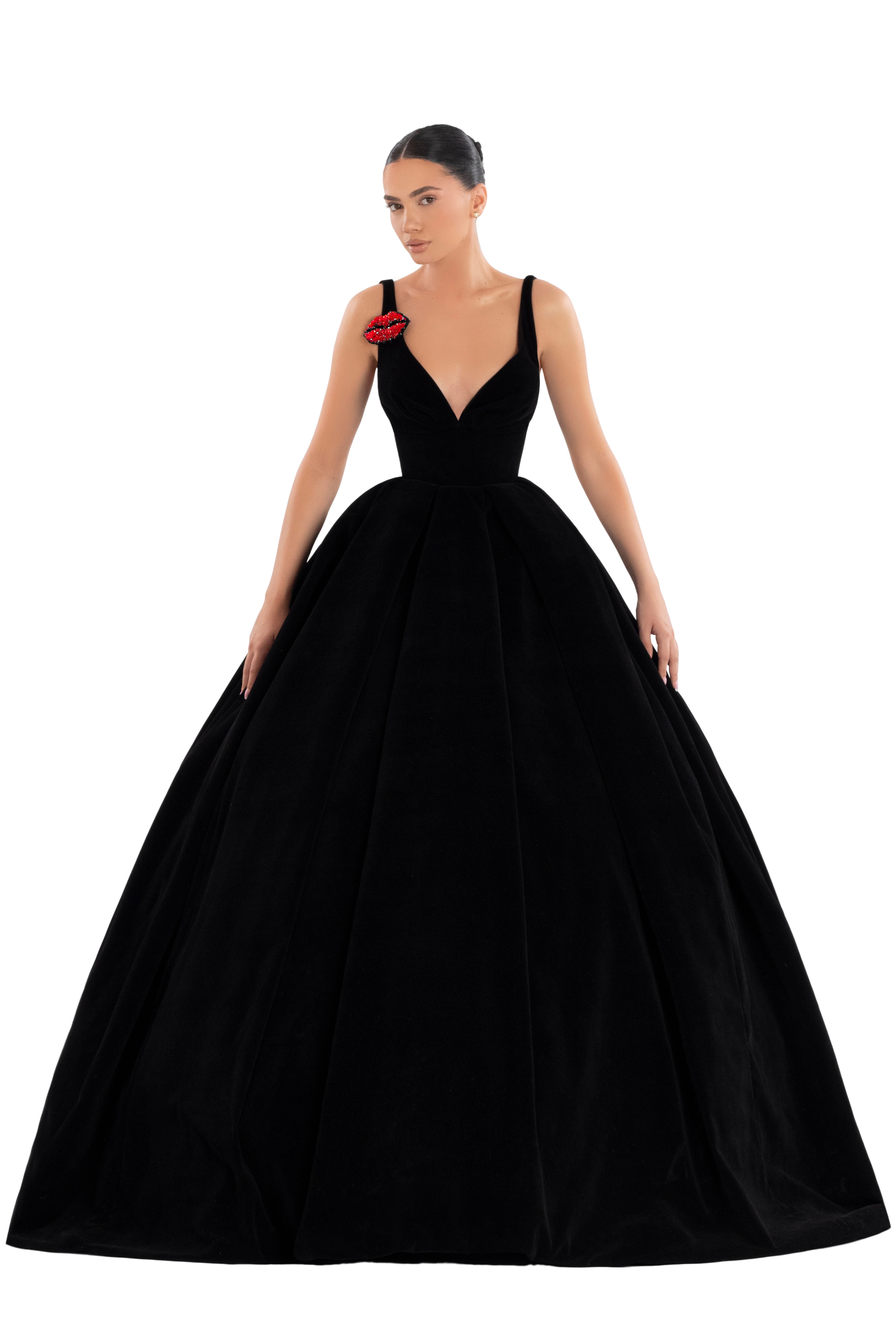 Featuring a deep V-neckline and a striking red lips embellishment on the shoulder, this dress exudes sophistication and a touch of playful charm. The voluminous skirt flows gracefully, making it perfect.