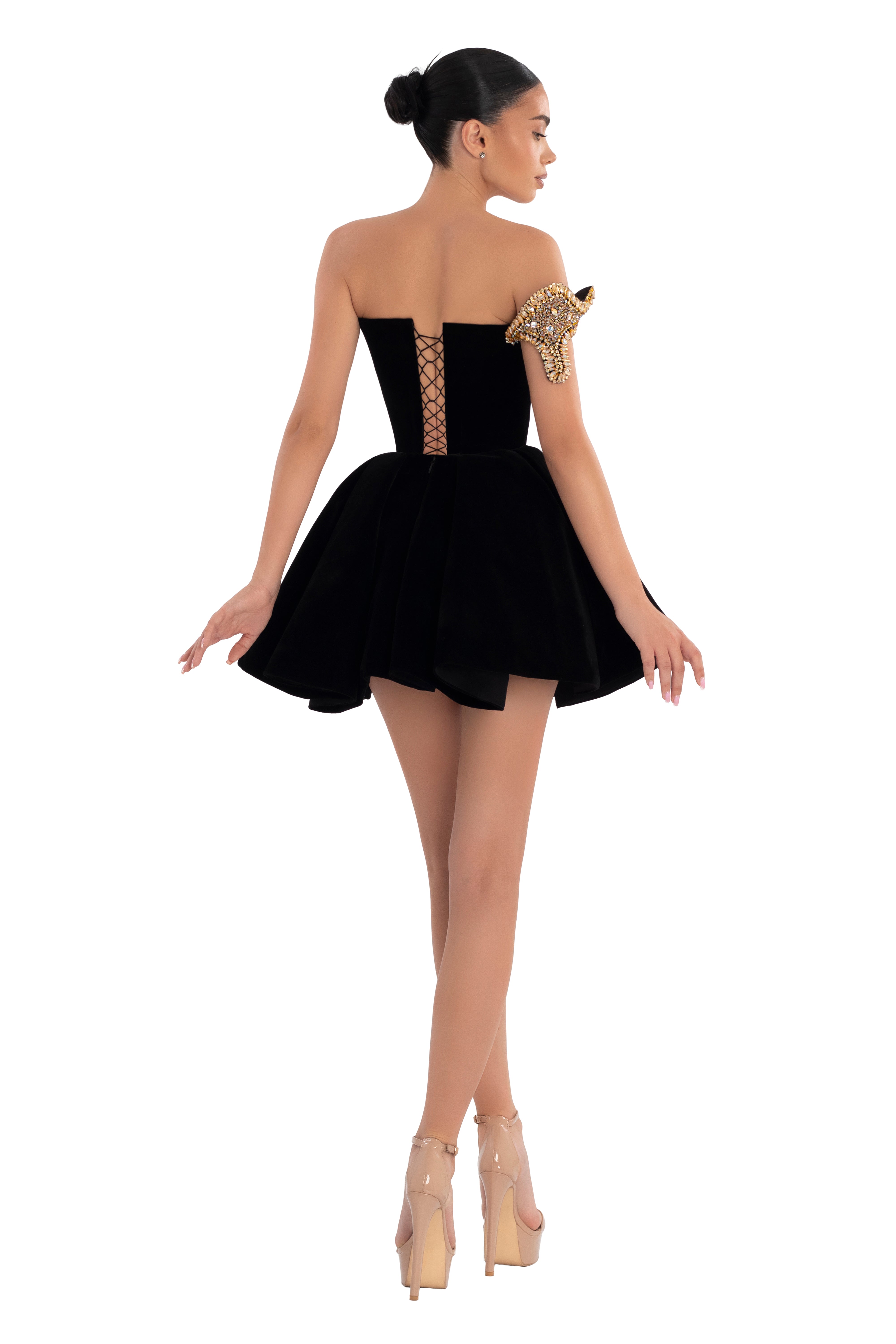 Chic black mini dress with an eye-catching gold and crystal wave embellishment on the shoulder. The lace-up back detail adds a modern twist to this elegant design.
