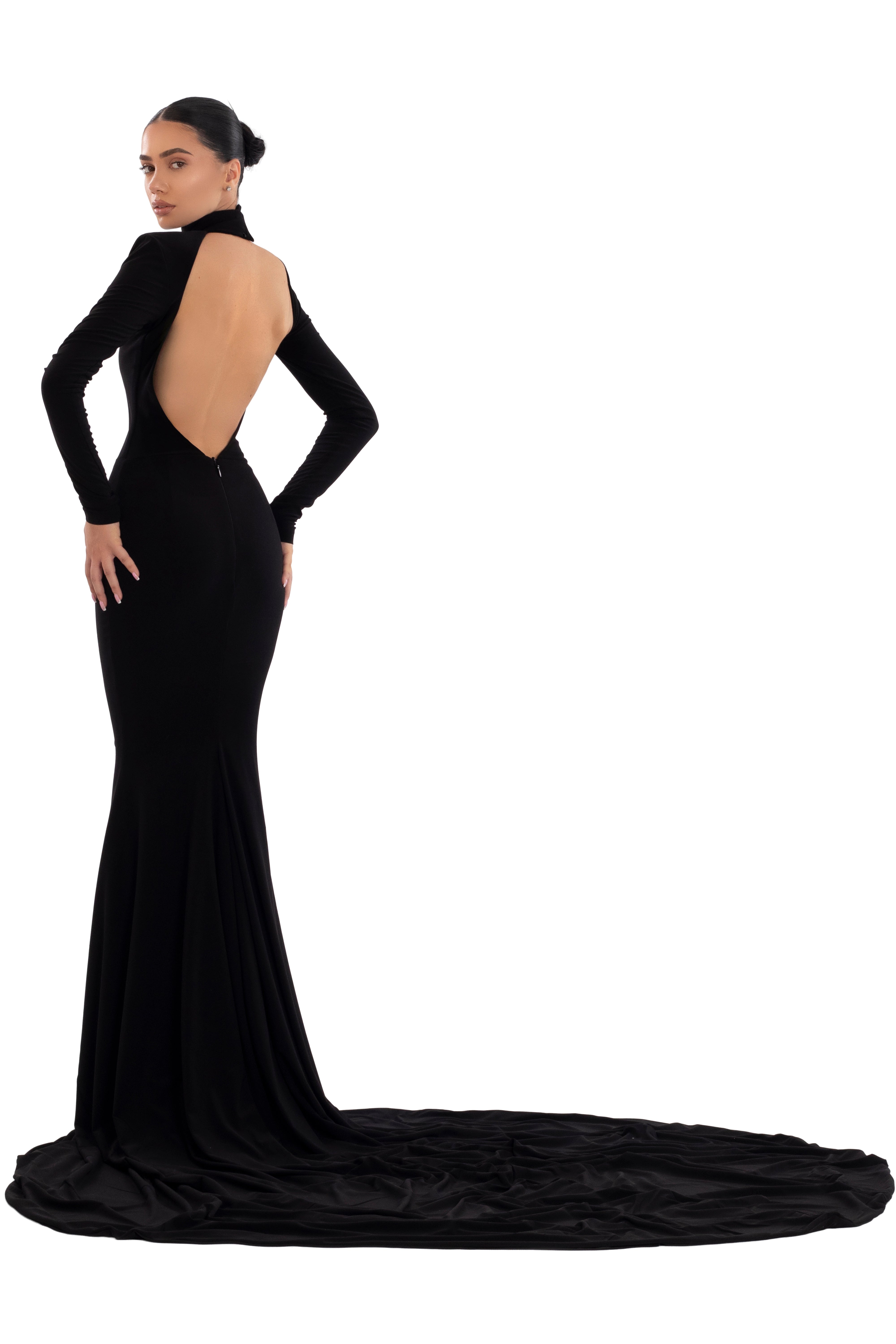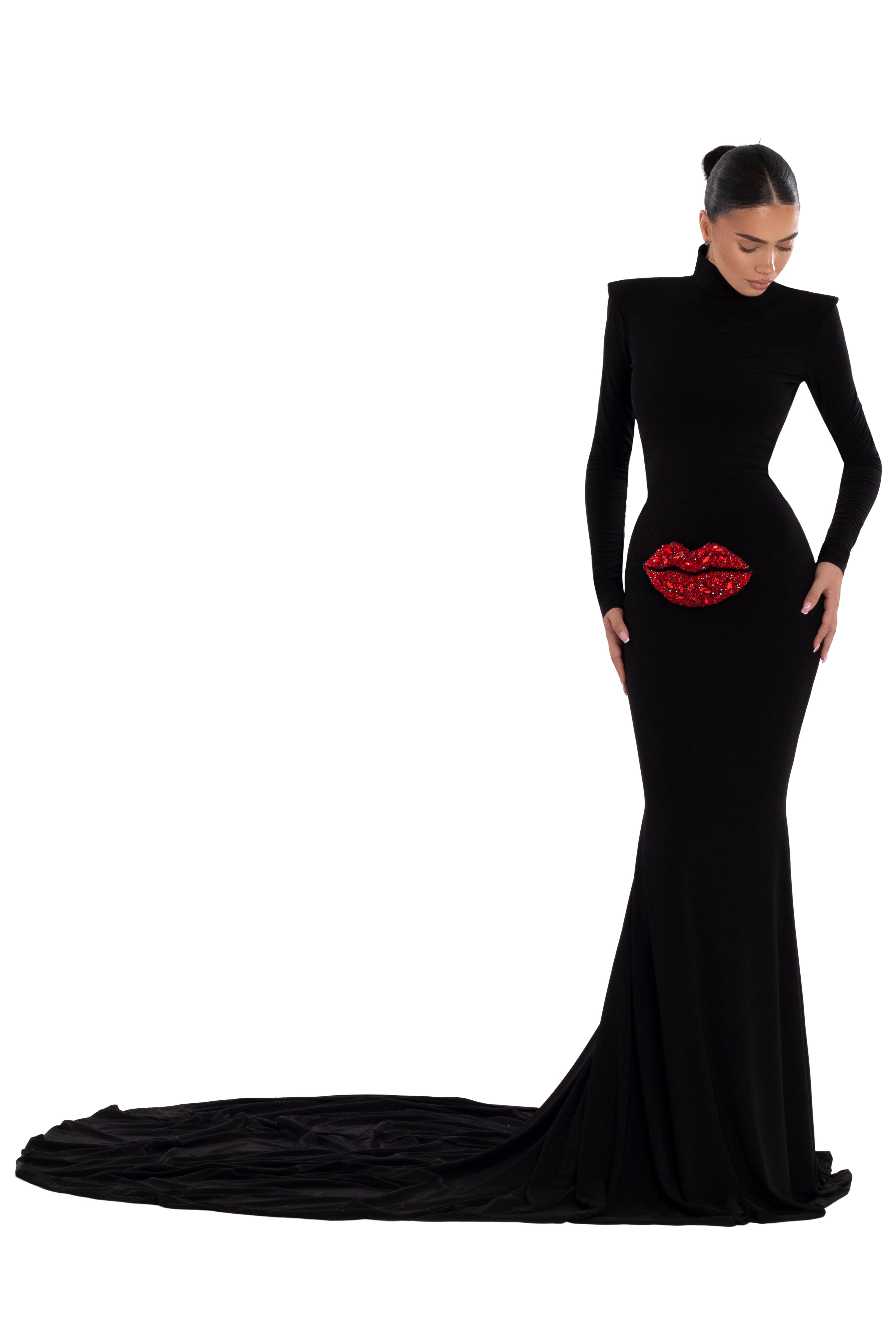 Black Dress with a handmade red lips detail, adorned with shimmering stones. The high neckline and open back create a captivating silhouette perfect.