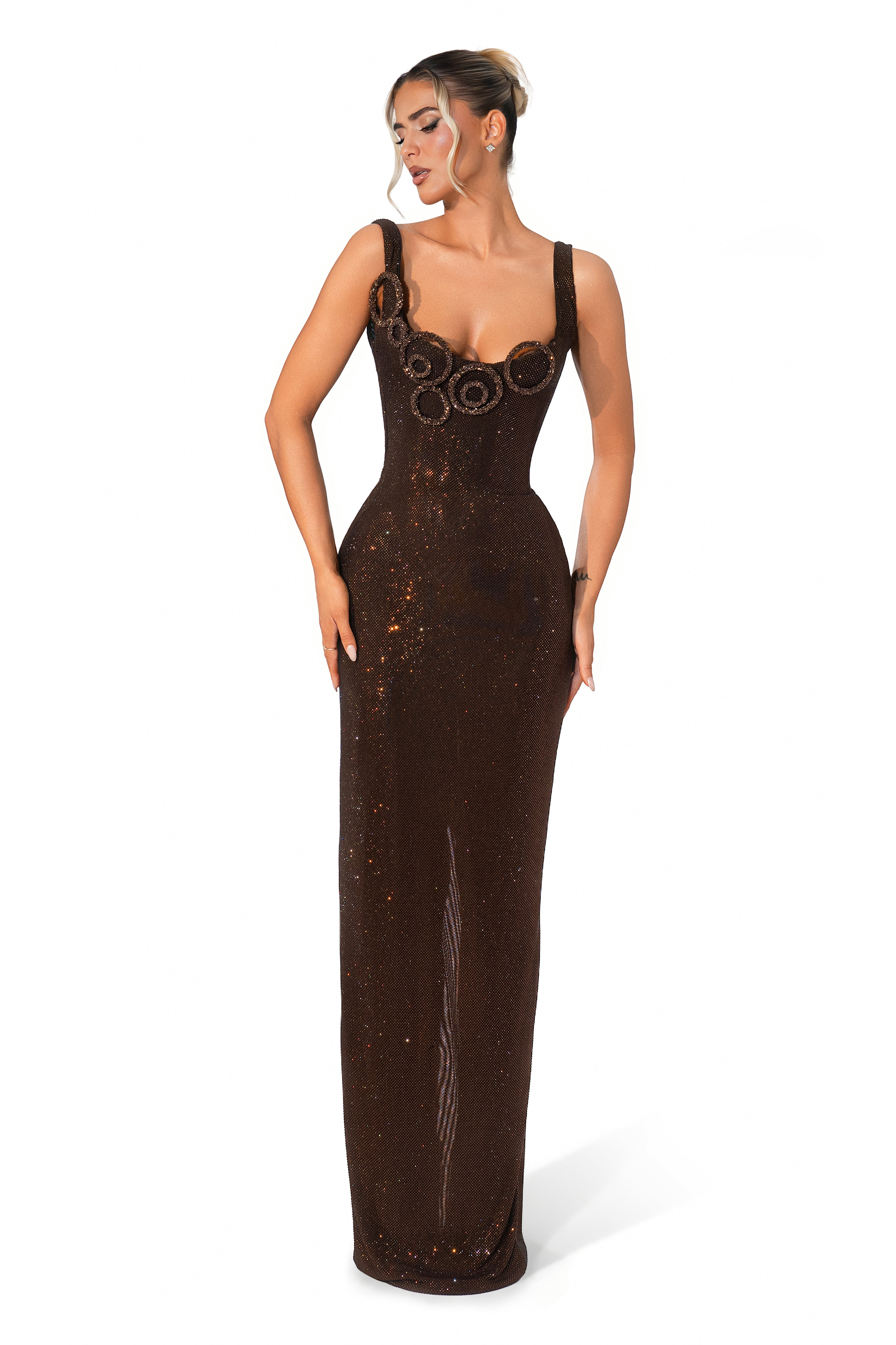 Decoration: Dark glitter fabric with neckline appliques and back slit for striking contrast.