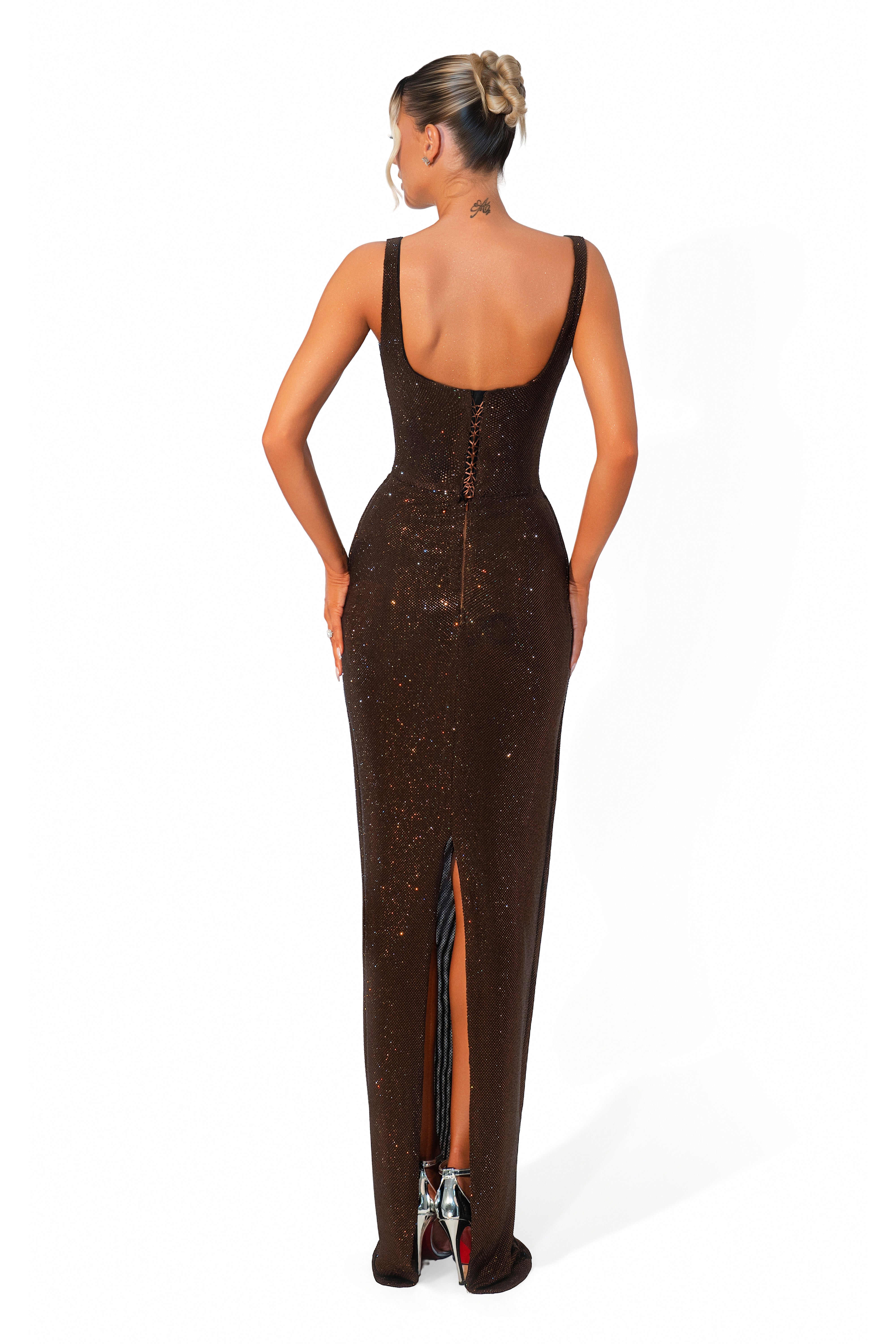 Deep scoop neckline with sculpted straps for a confident, refined silhouette.