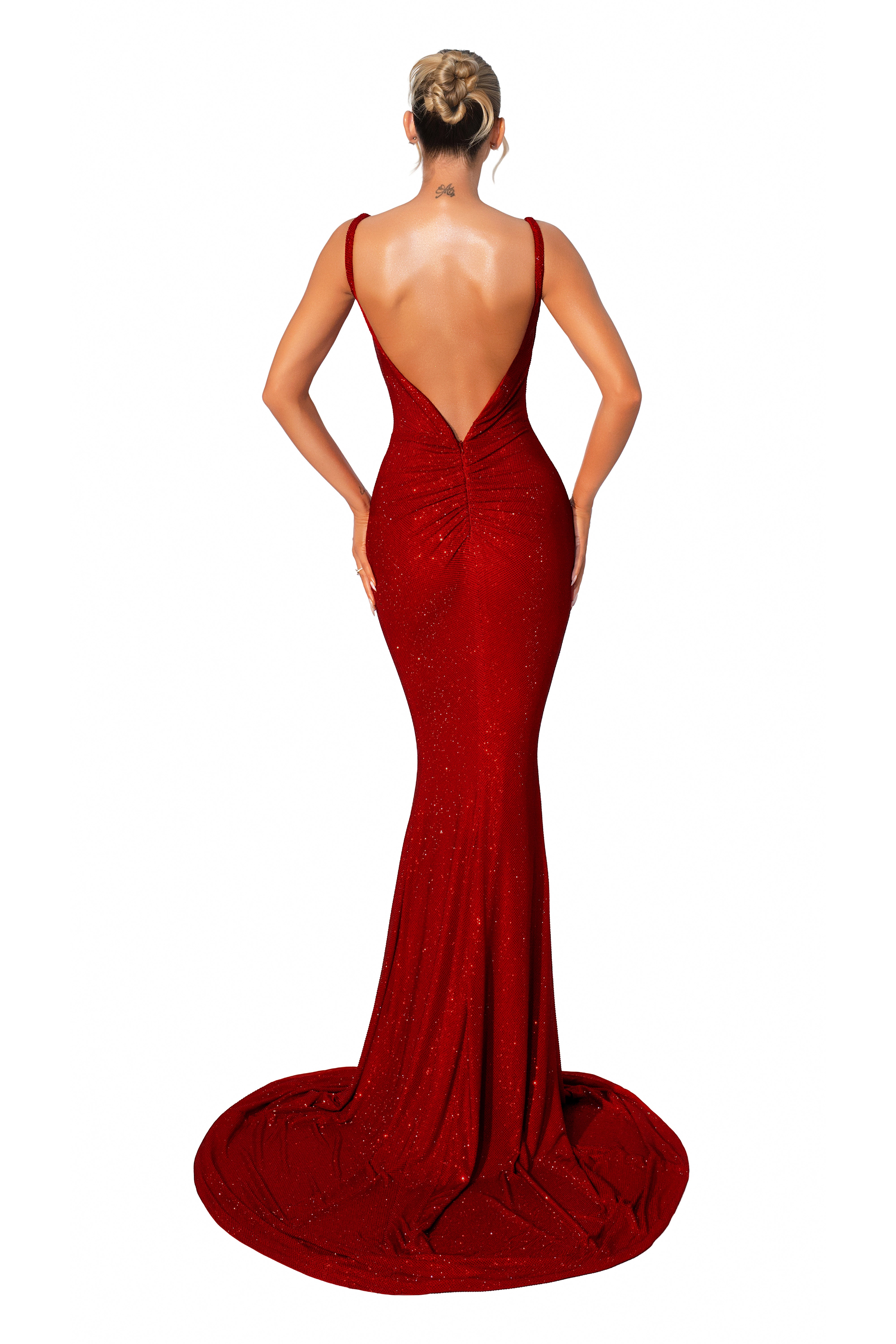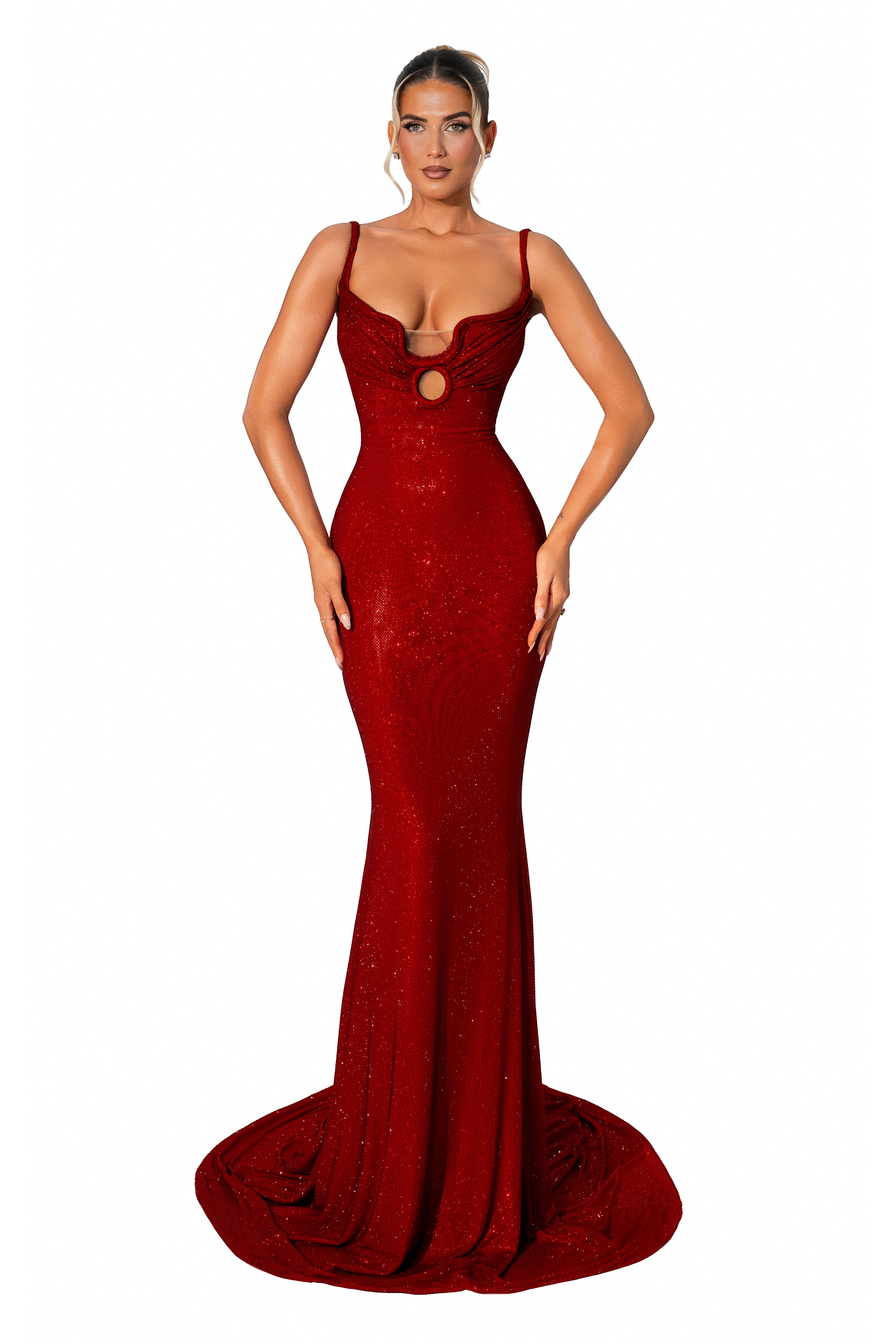 Decoration: Glittering scarlet fabric with front keyhole cut-out, plunging back, and flowing train.