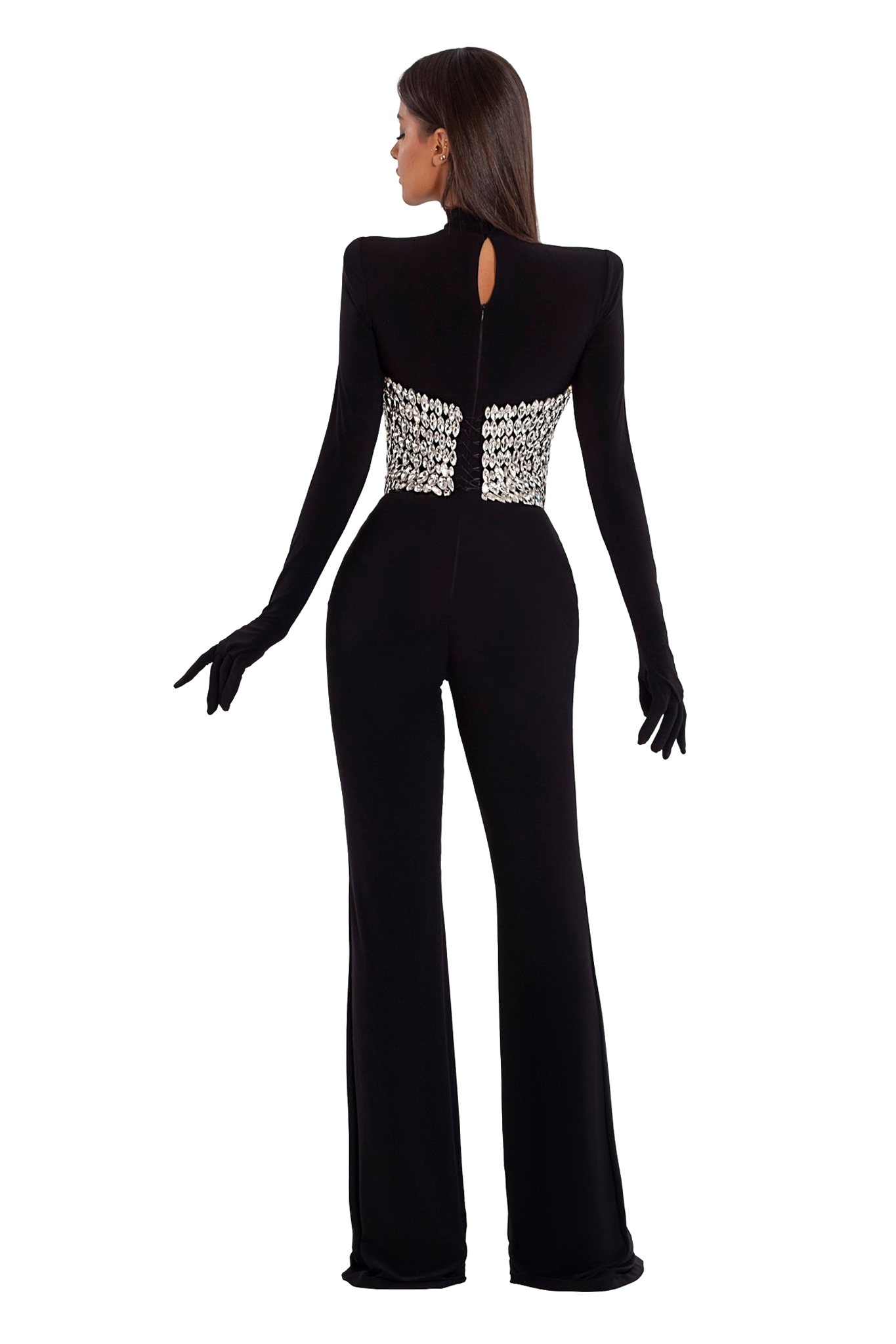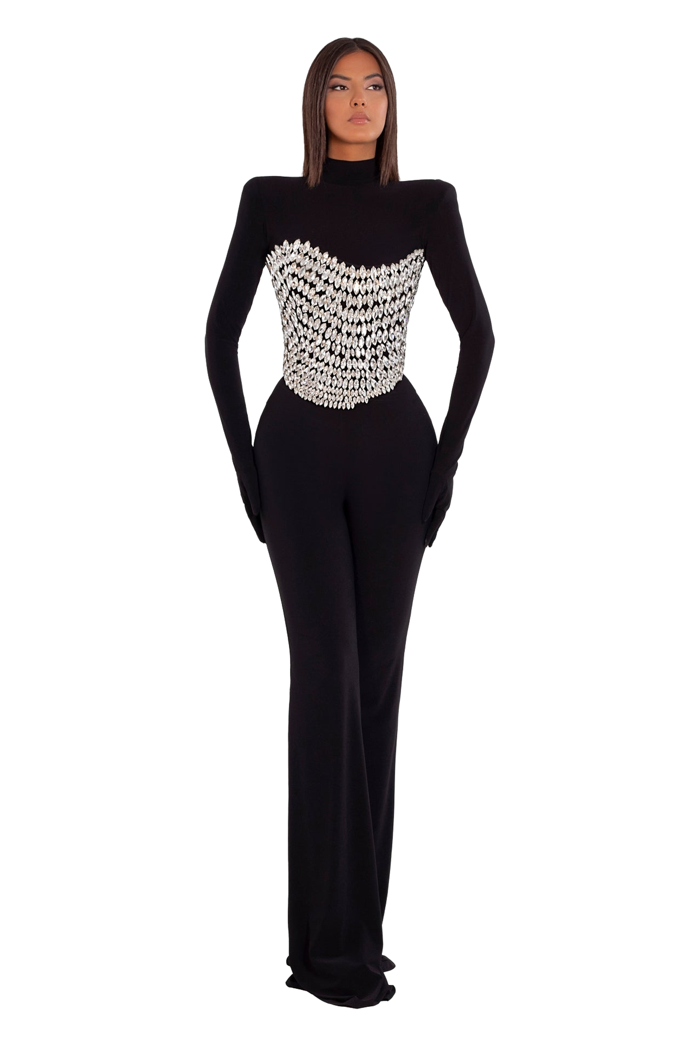 A jumpsuit has silver big stones, high neck, long sleeve and gloves.