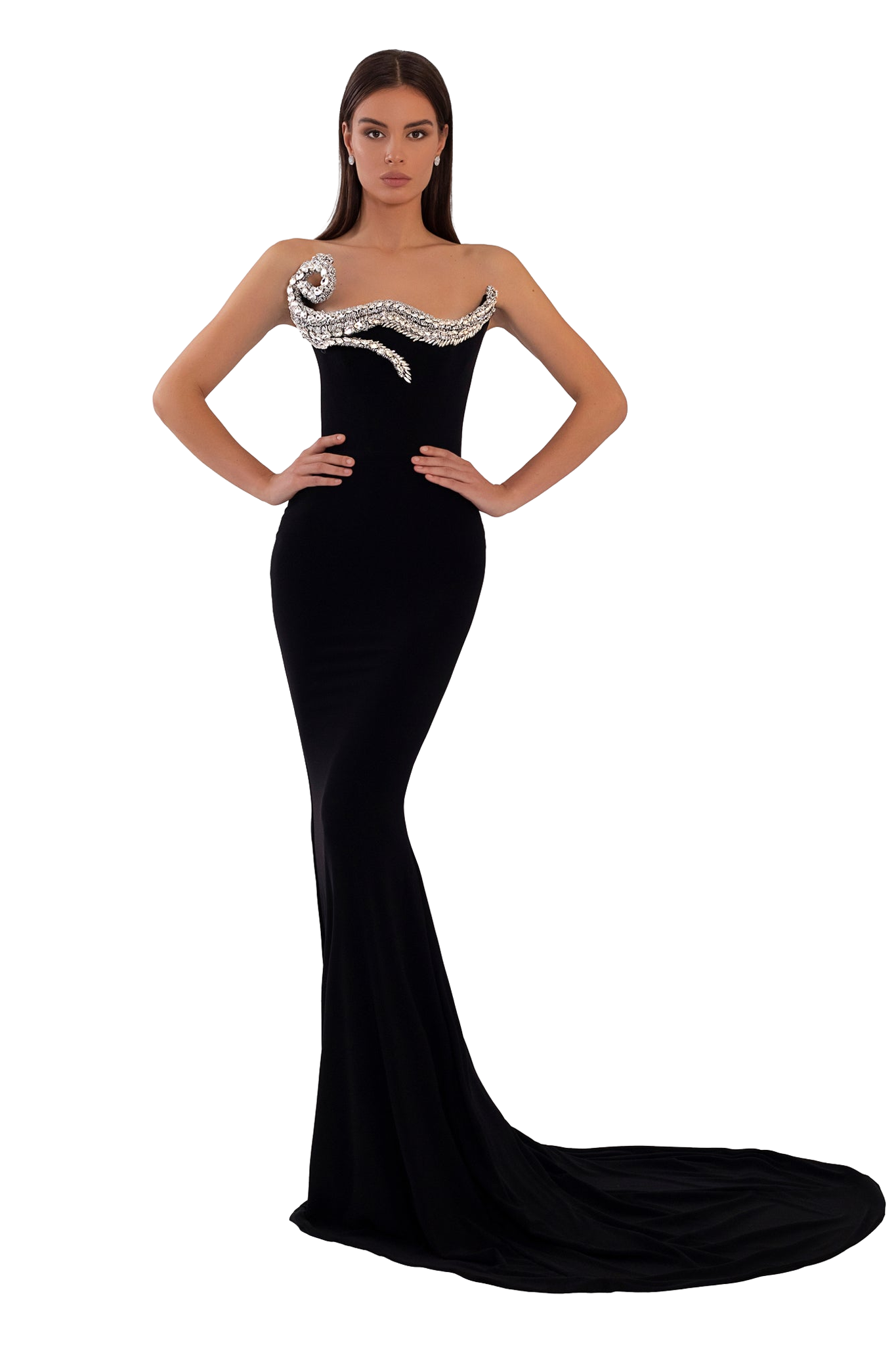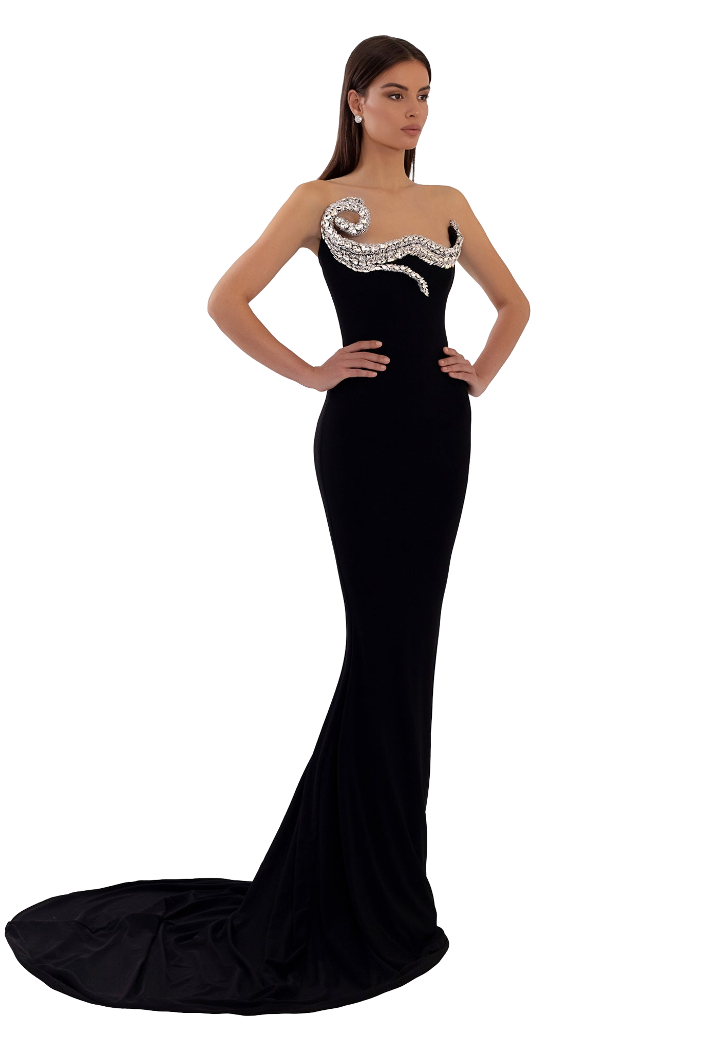 The black dress with long train inserts an hand-embroidered crystals with an elastane material.
