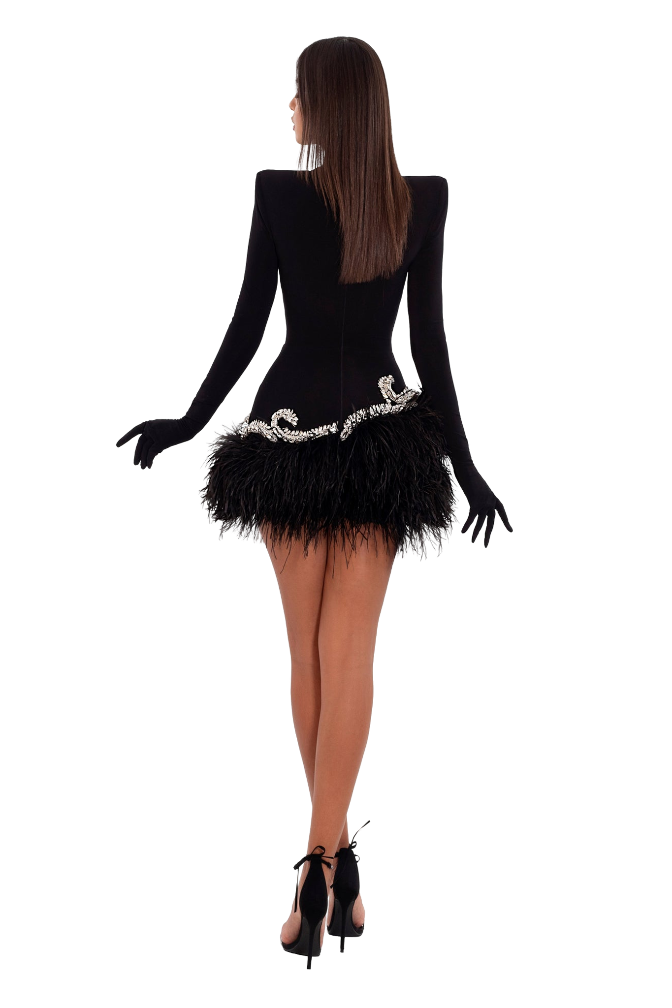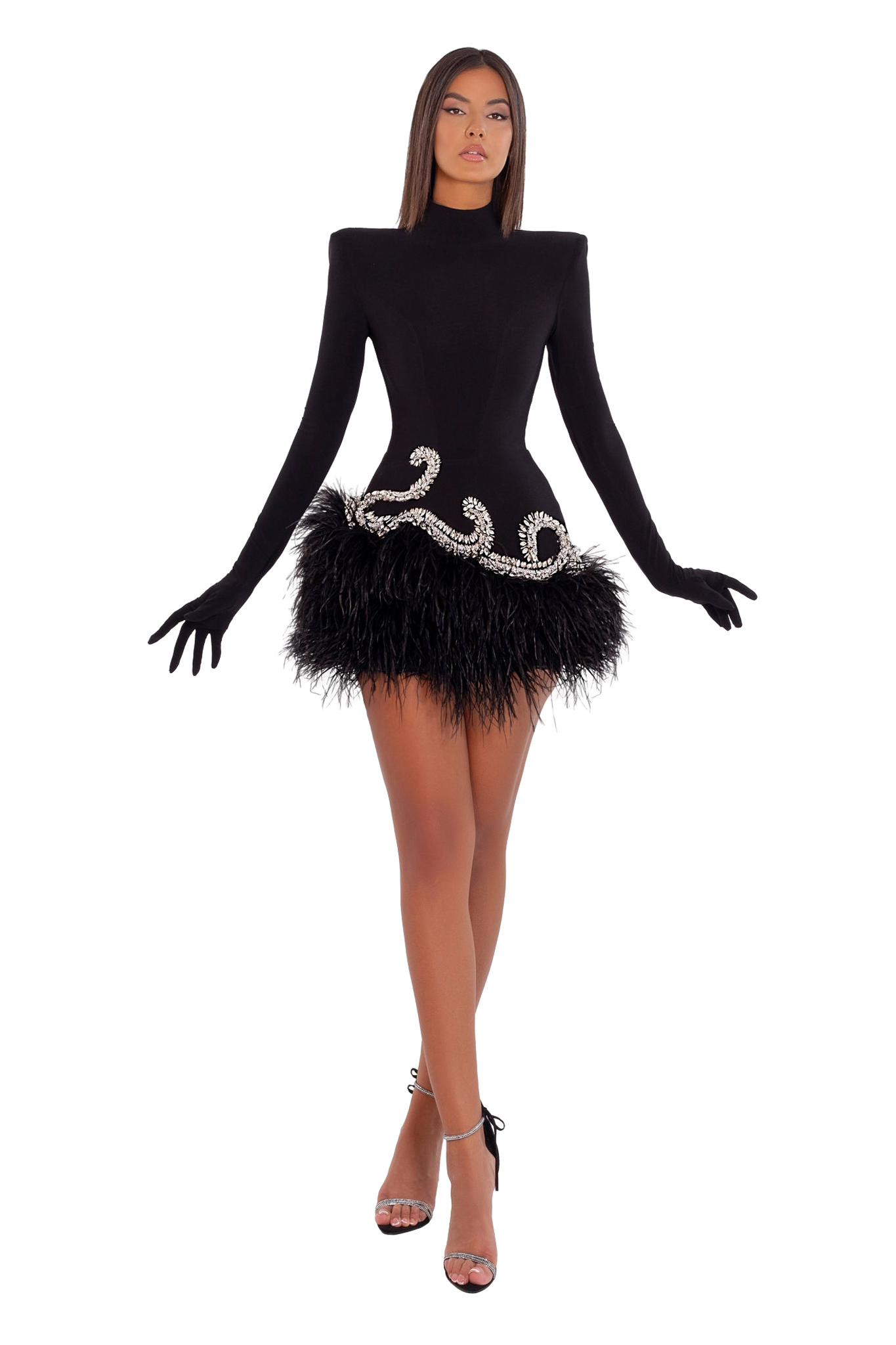The dress has high neck, long sleeve, gloves and bottom with stone details and feathers.