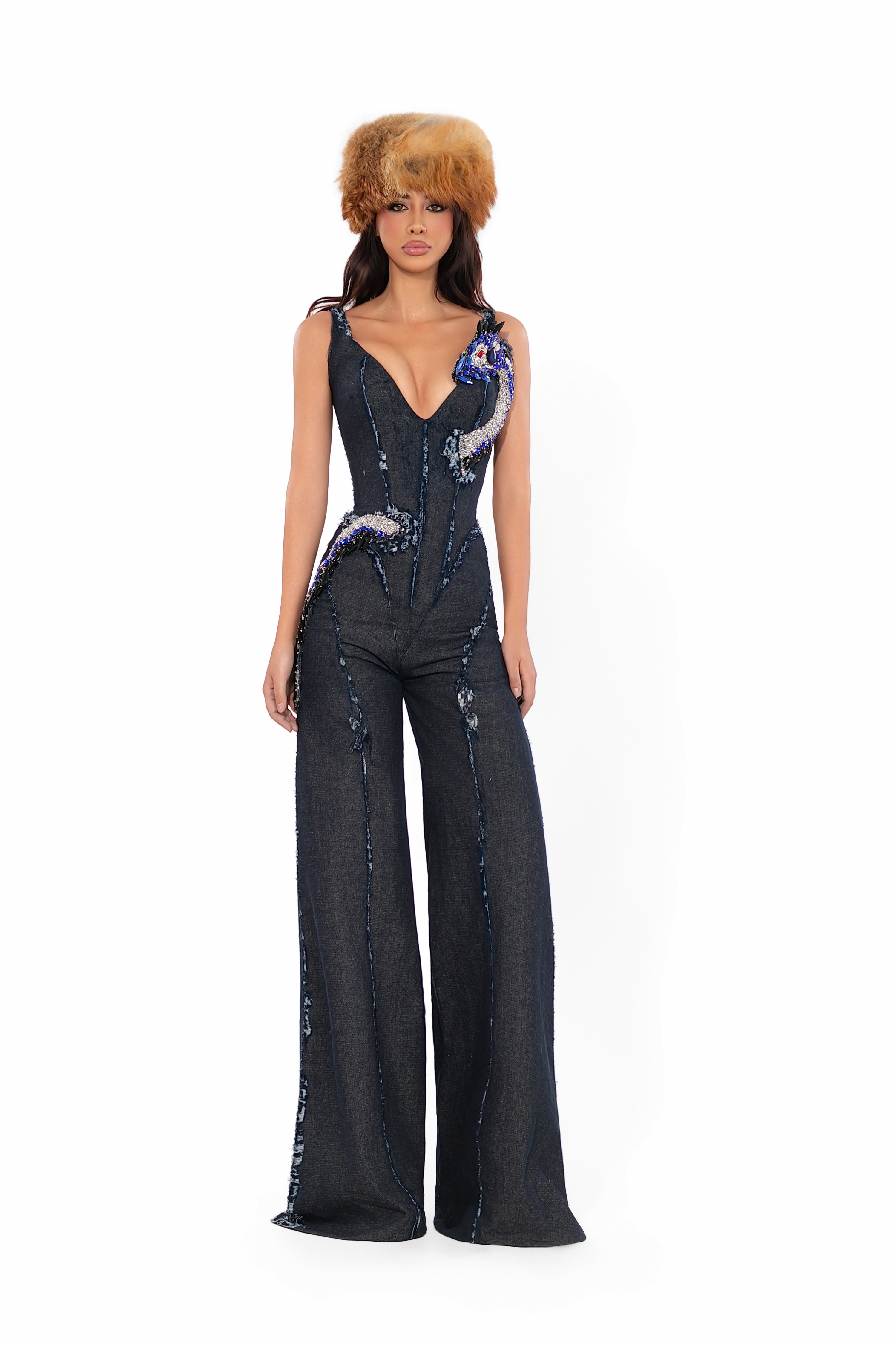 DECORATION: Machine-applied crystal and bead embellishments with linear and scattered arrangements