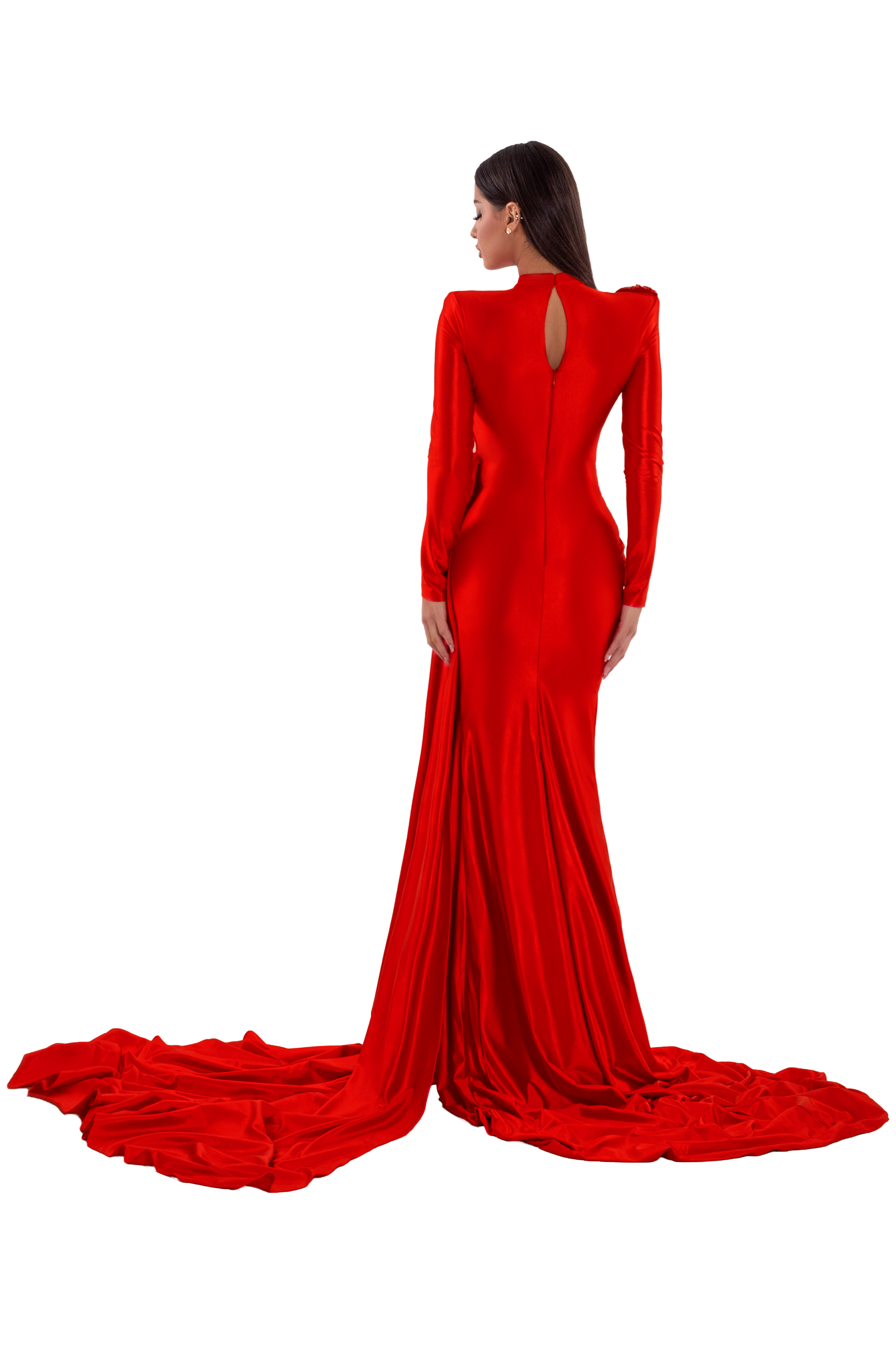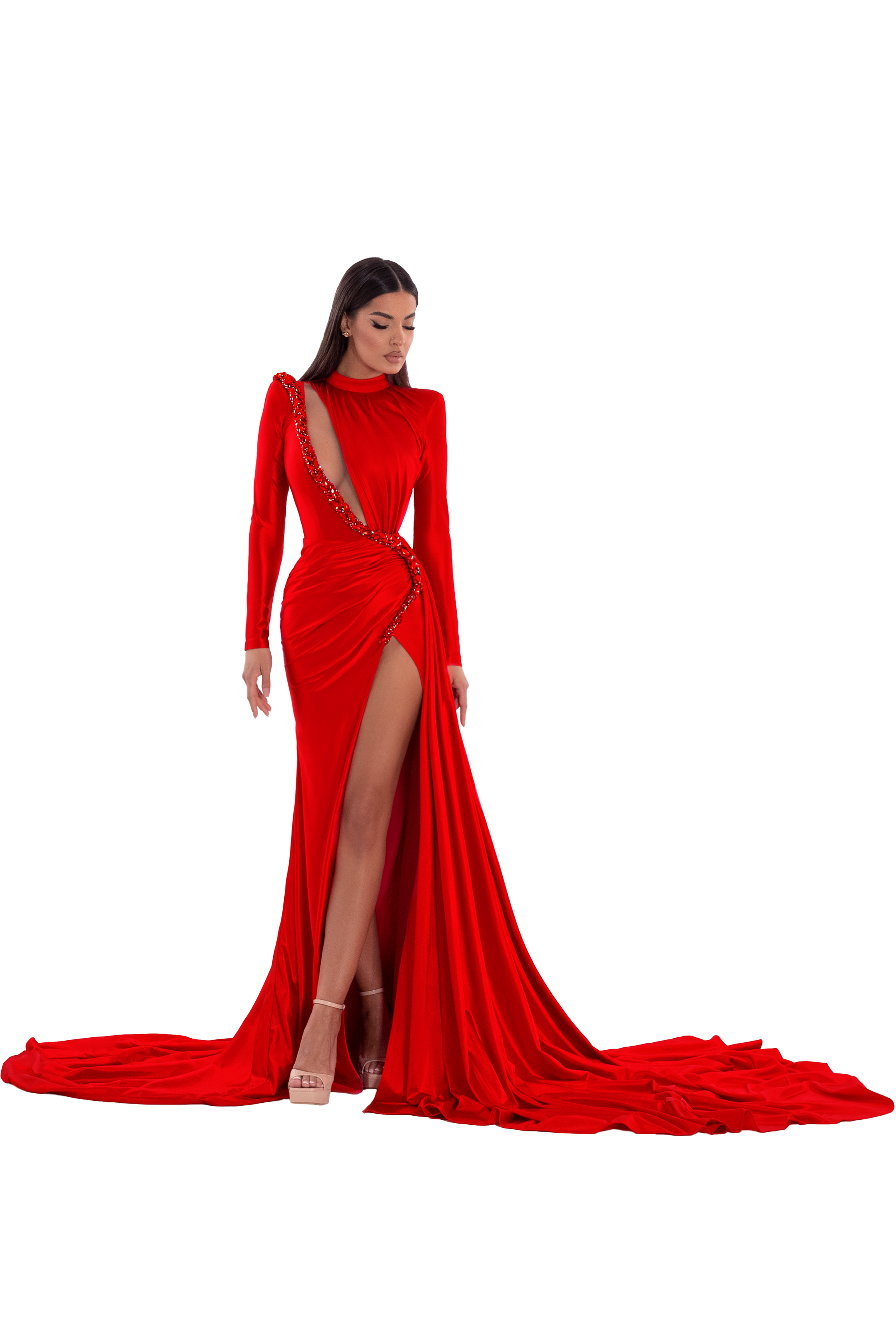 THE BOTTOM OF THE DRESS HAS SLIT ON A LEFT SIDE AND WITH A LONG TAIL.