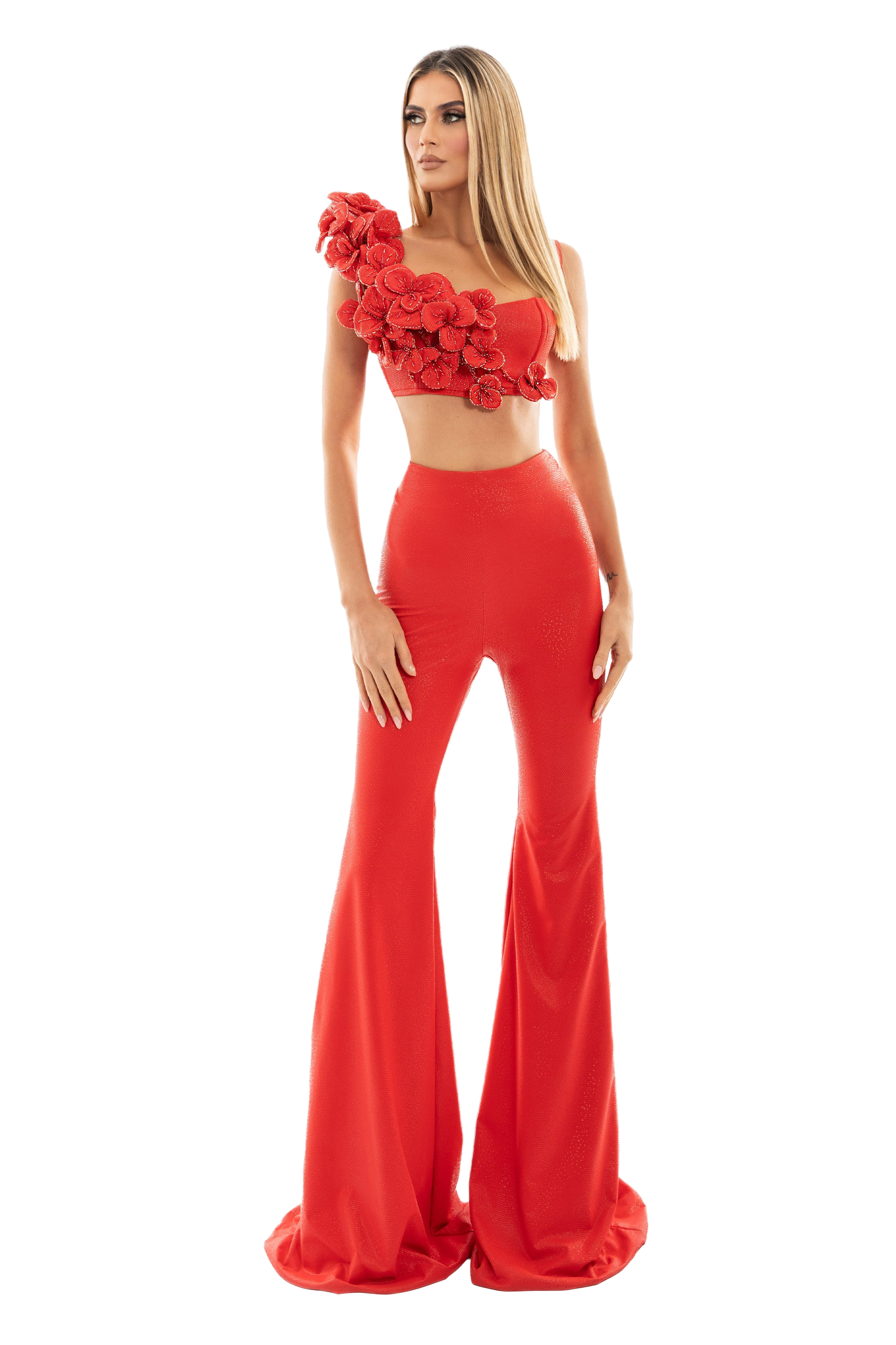 Crop top with embellished floral details in the upper part and long flared trousers.
