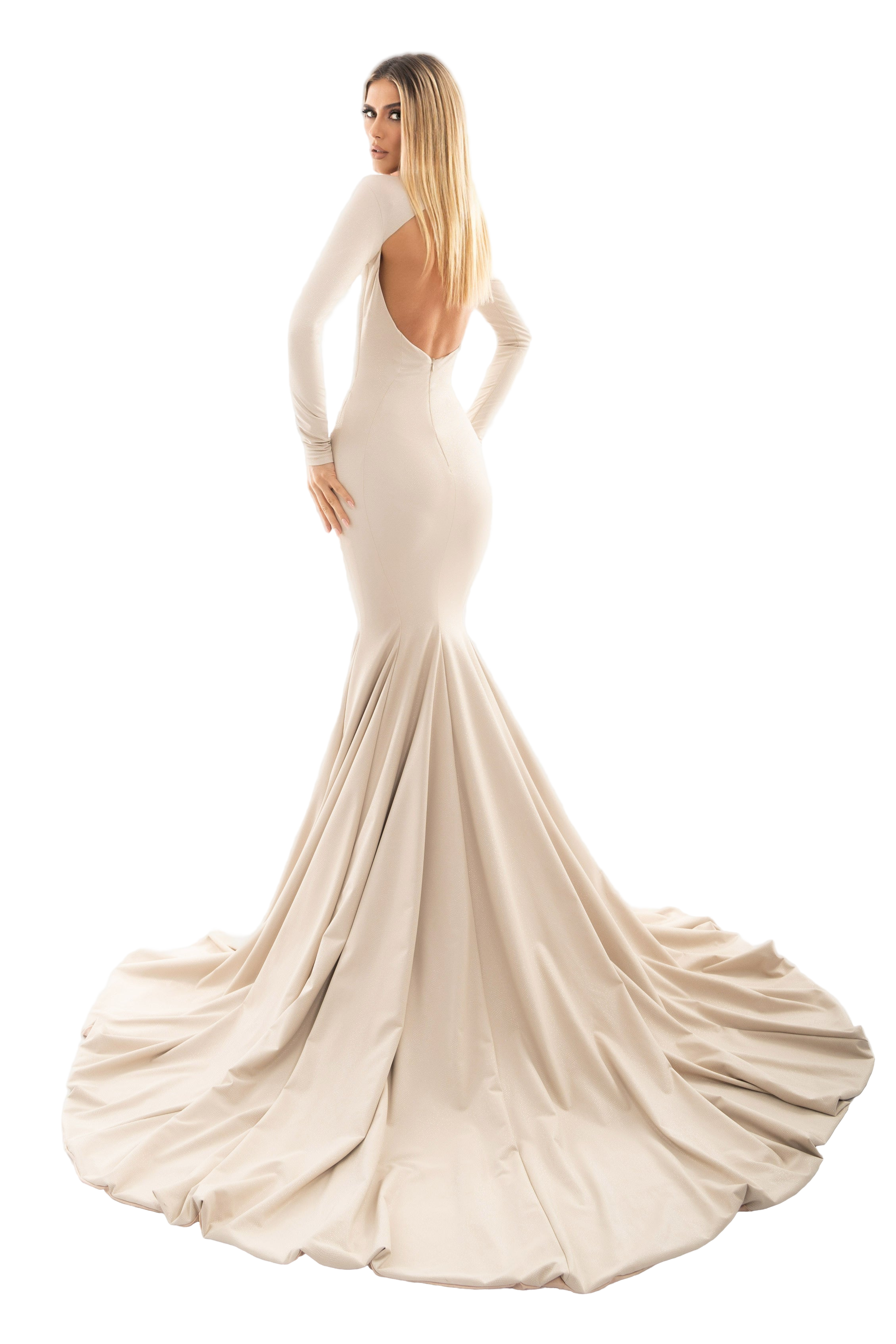 Long mermaid cream dress with long sleeves and open chest with rose detail in the neck.