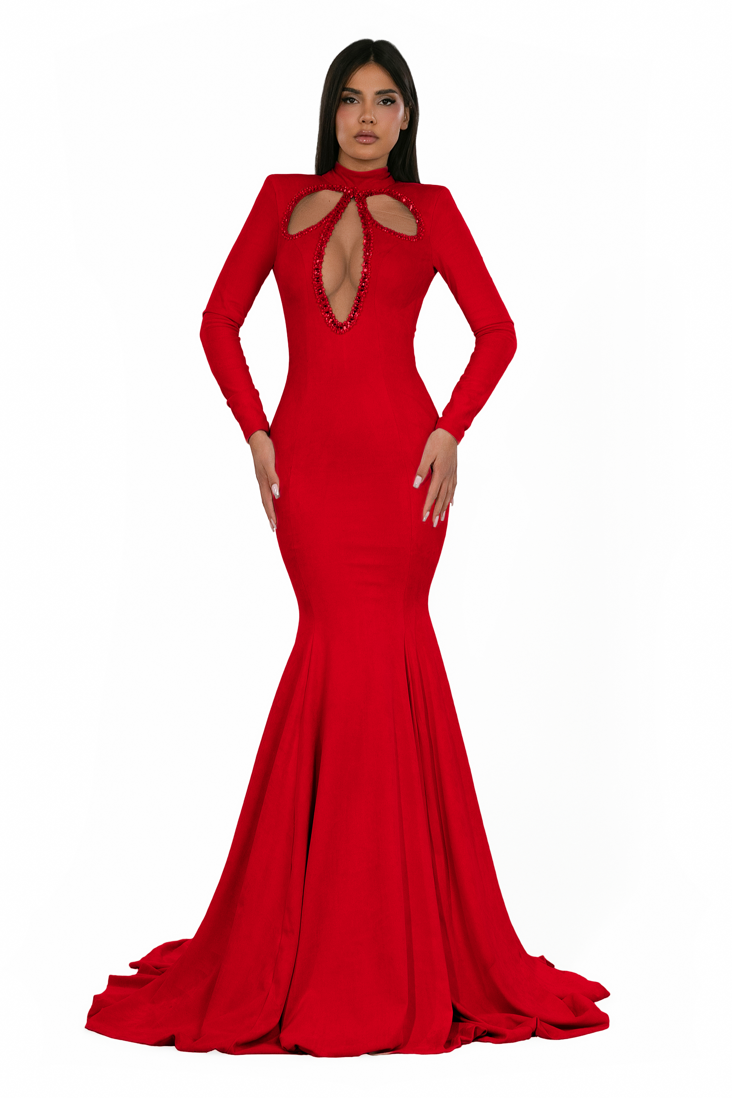 Decoration: Hand-finished neckline featuring a triple-keyhole cutout design, meticulously bordered with hand-applied crystal trim and silver glass seed beads for a high-contrast, structural sparkle.