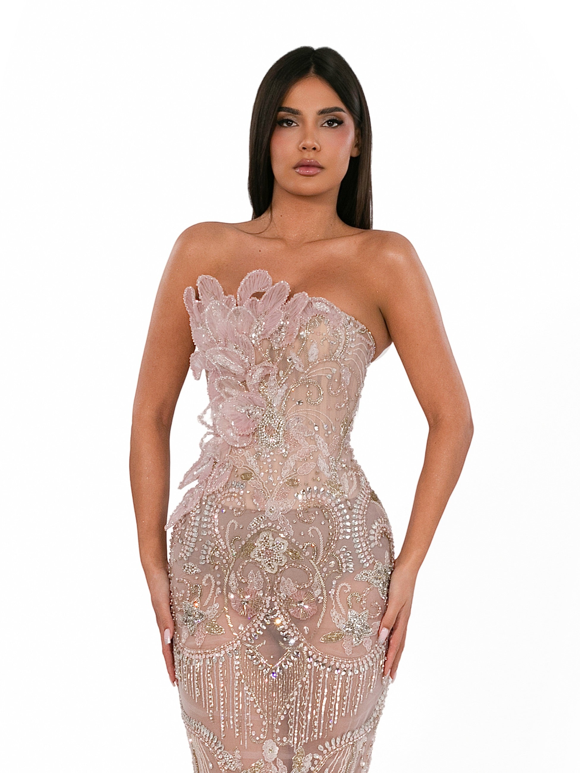 Decoration: Hand-crafted artisan bodice featuring a strapless neckline accented by a side-swept cluster of layered 3D organza petals, intricate silver vine threadwork, and shimmering crystal fringe.