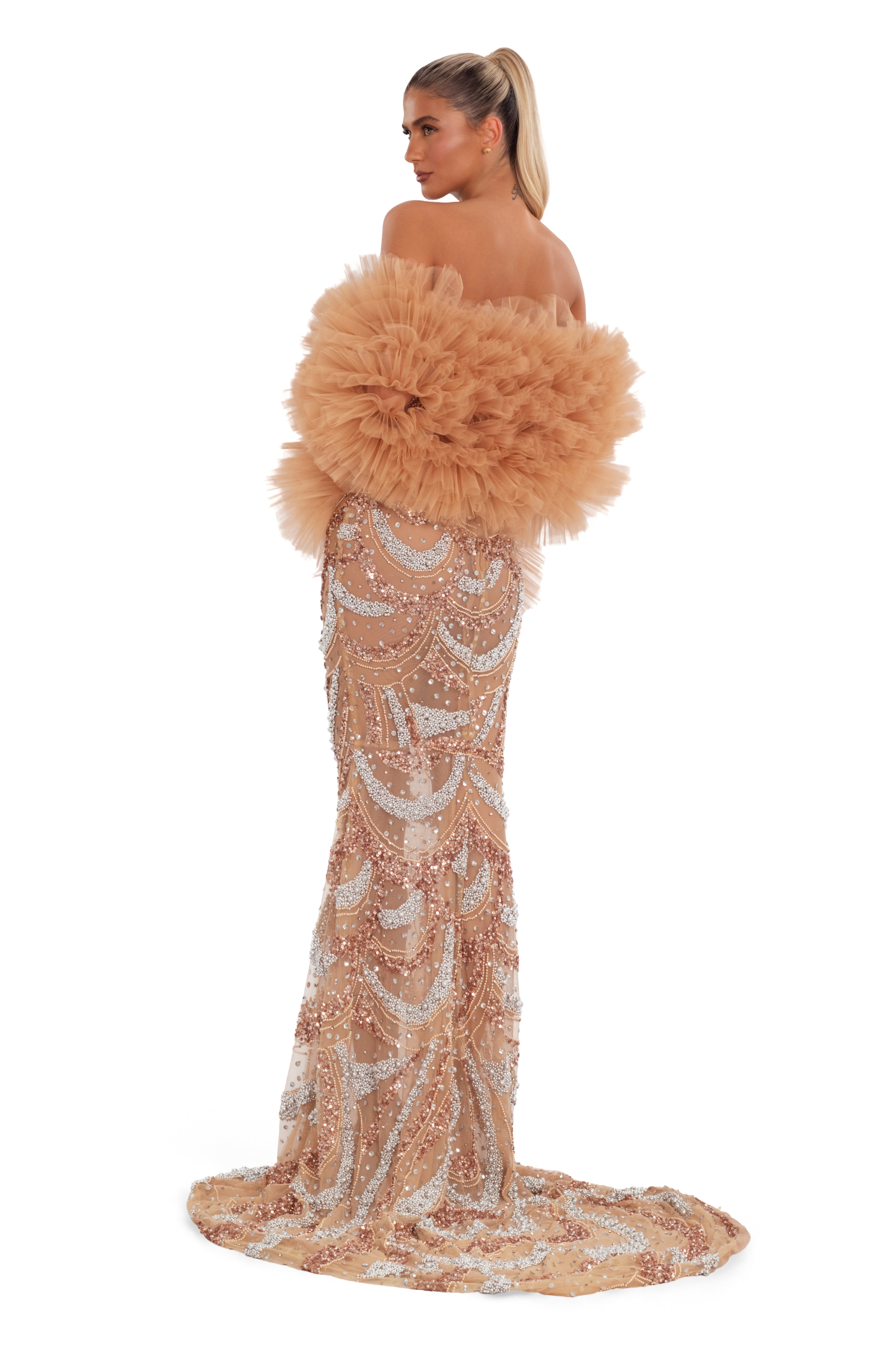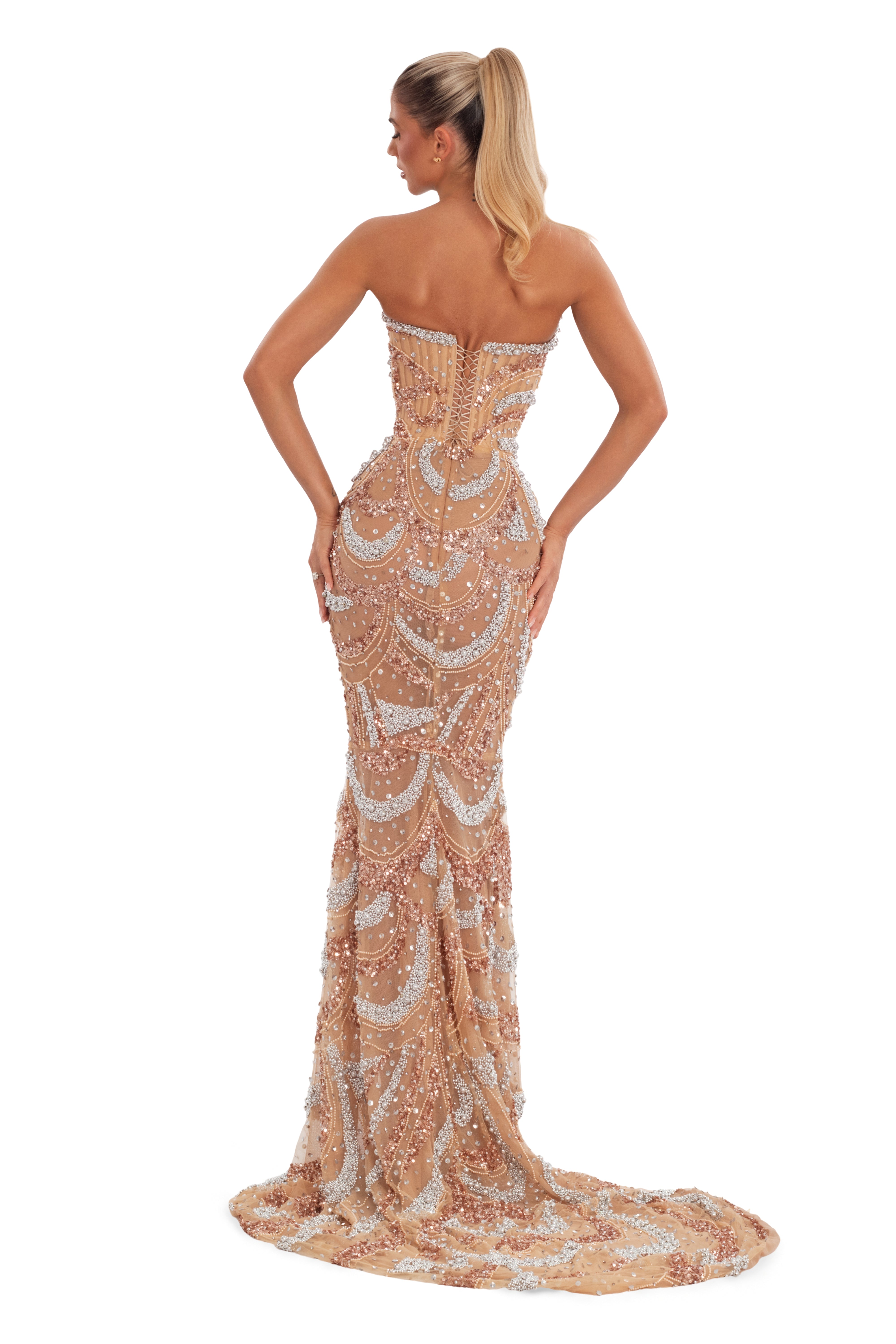 Silver & rose gold beadwork on nude mesh
