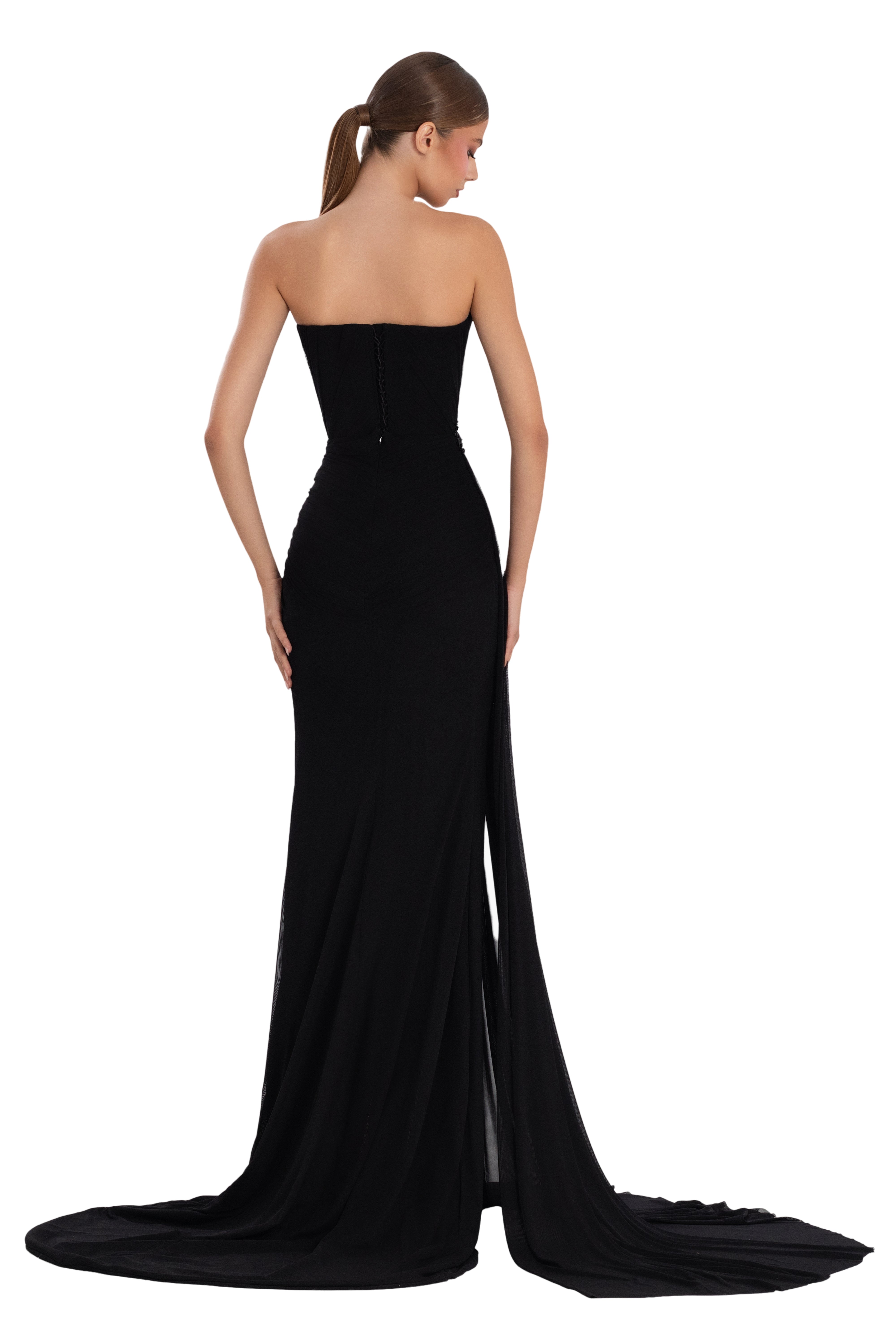 Elegant strapless neckline with intricate hand-applied beadwork