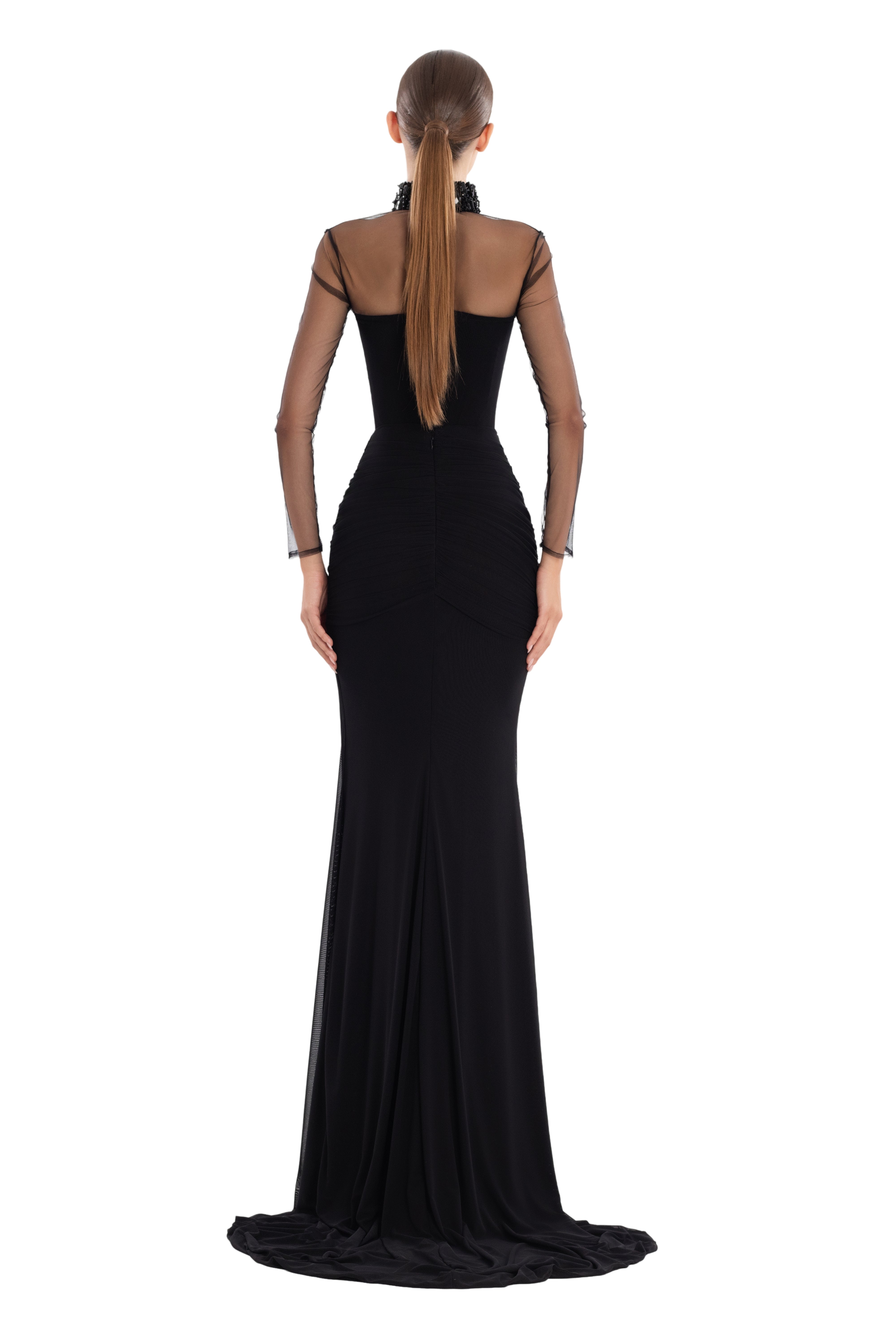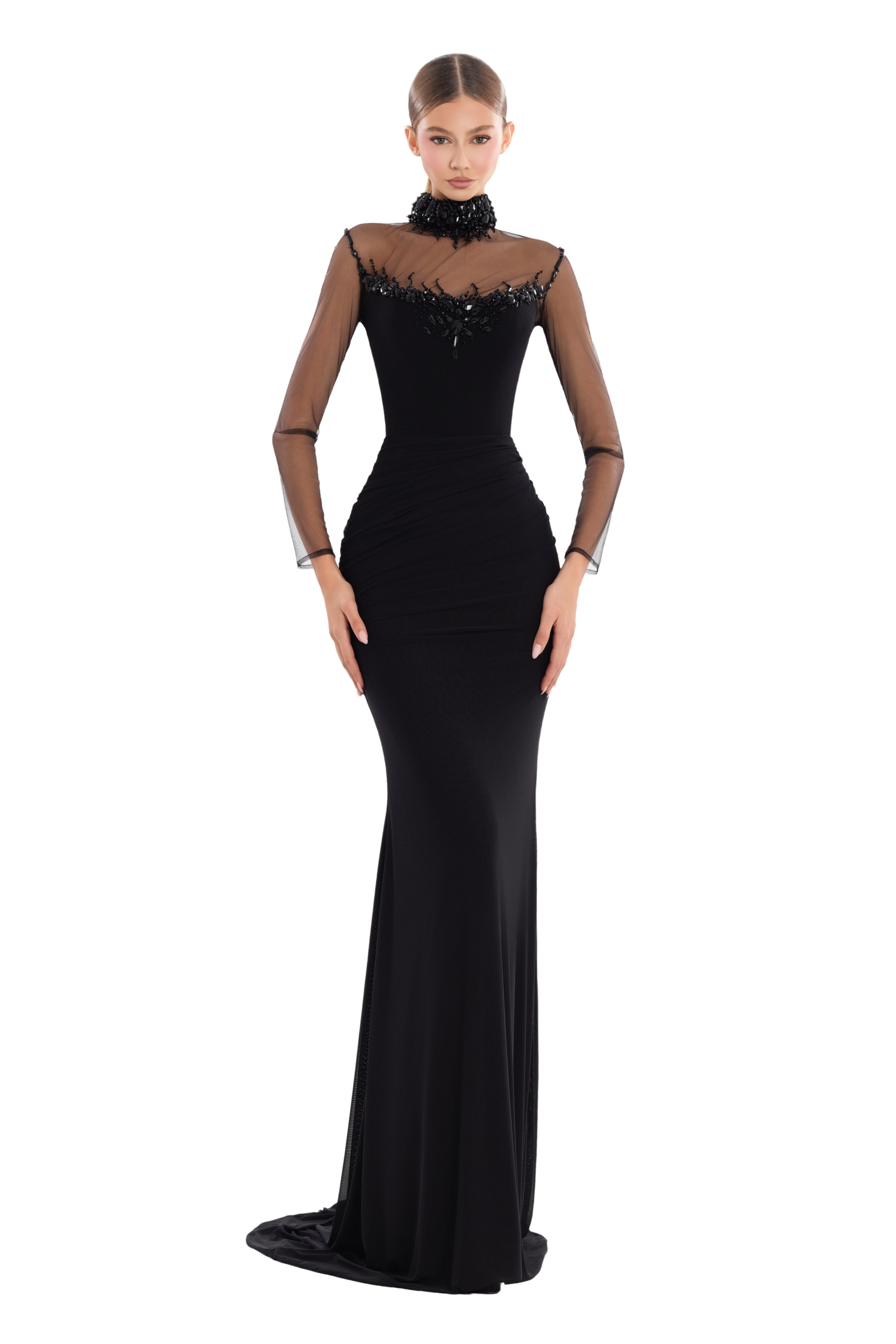 A captivating high-neck gown featuring sheer long sleeves adorned with intricate beadwork