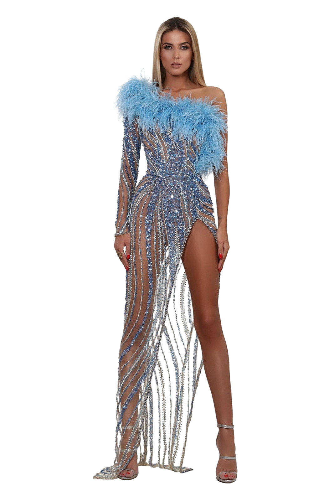 Description: Long blue dress one sleeved, detailed with feathers. Straight fitted dress, with front slit.