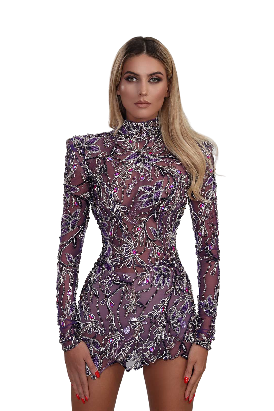 Description: Short purple dress. Embroidered with stones, crystals and beads with long sleeves and high neck.