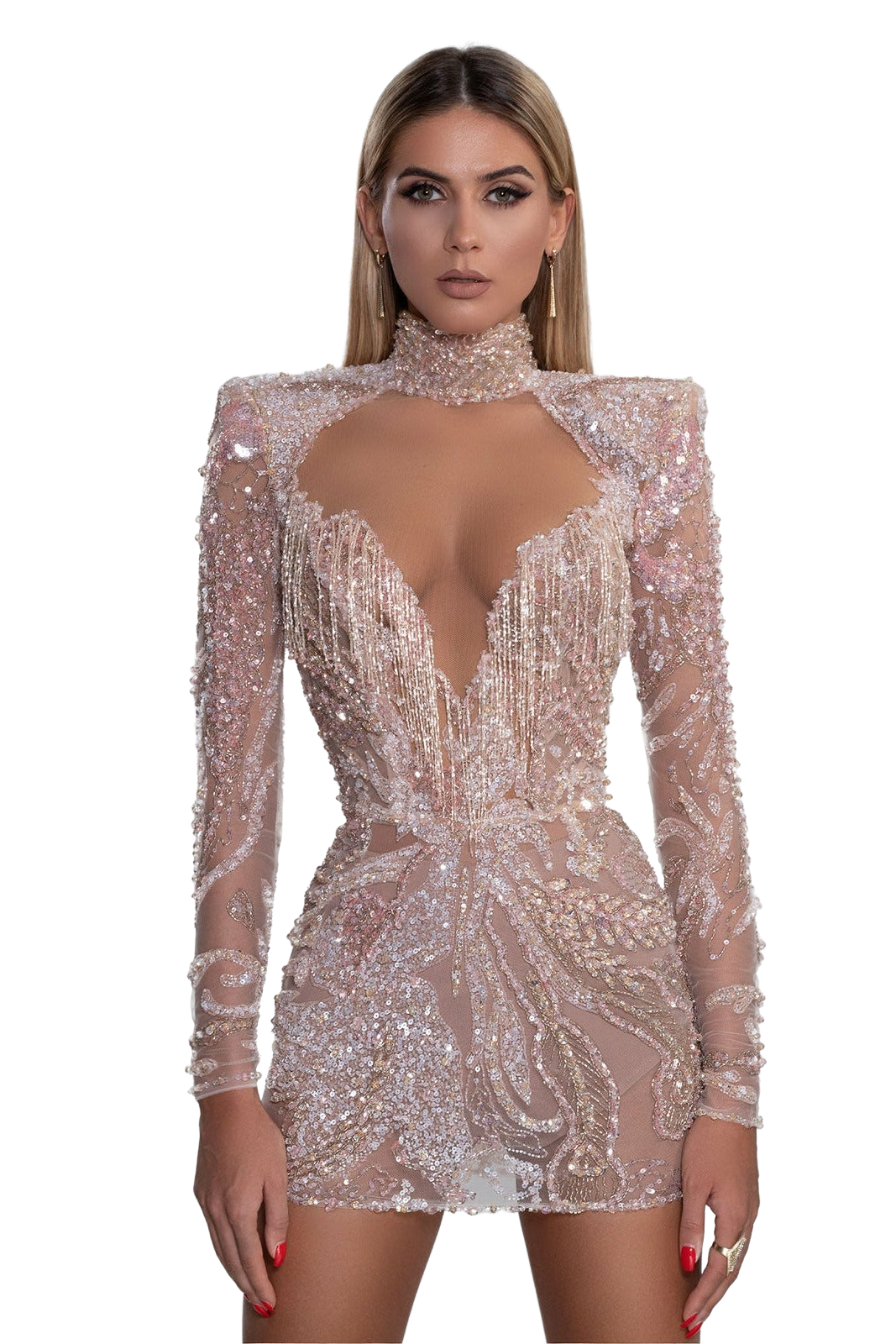 Description: Short rose-nude dress. All embellished with nude and gold embroidery. High neck and open chest, with long sleeves and fringe corset.