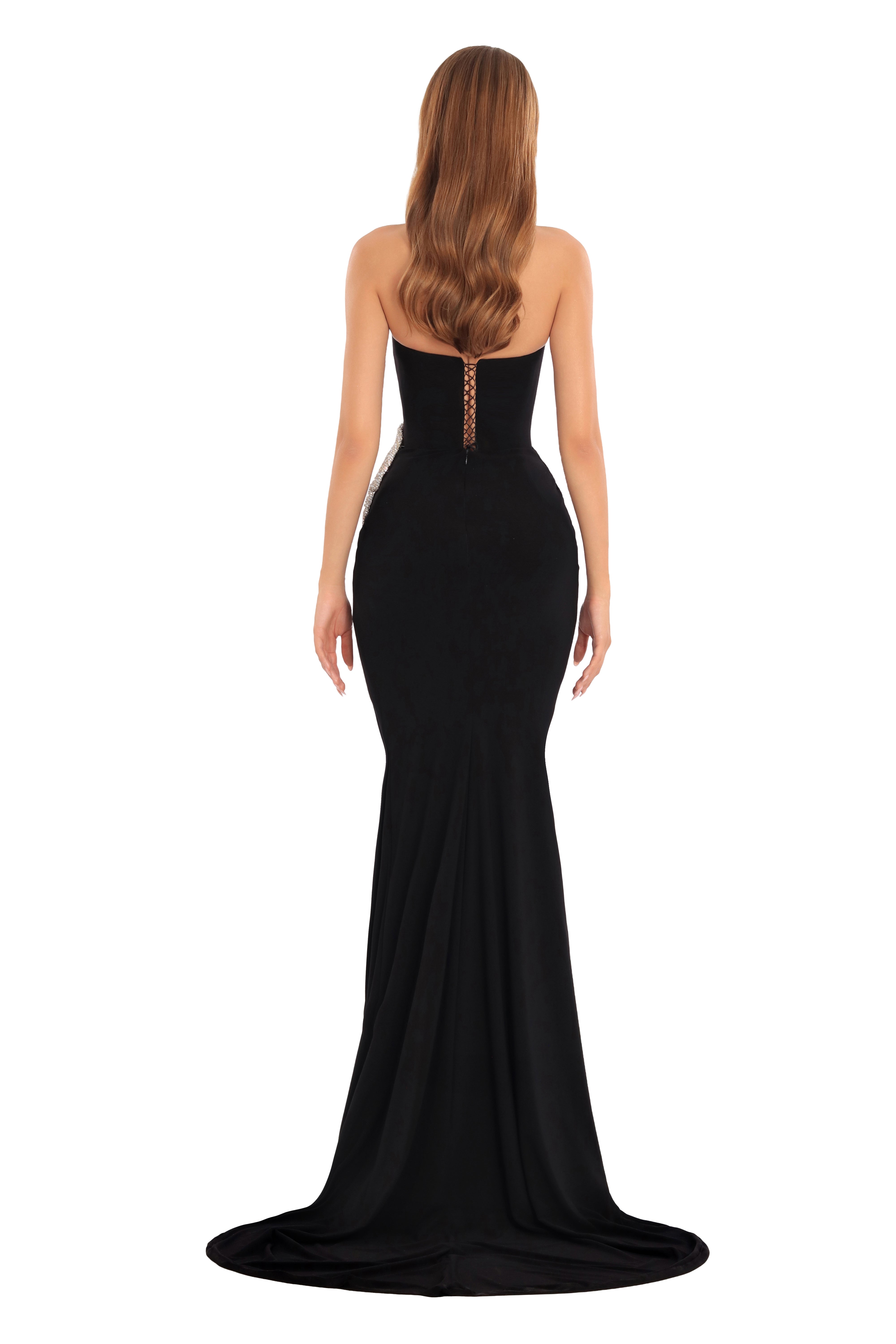 • Strapless black gown with ruched hip