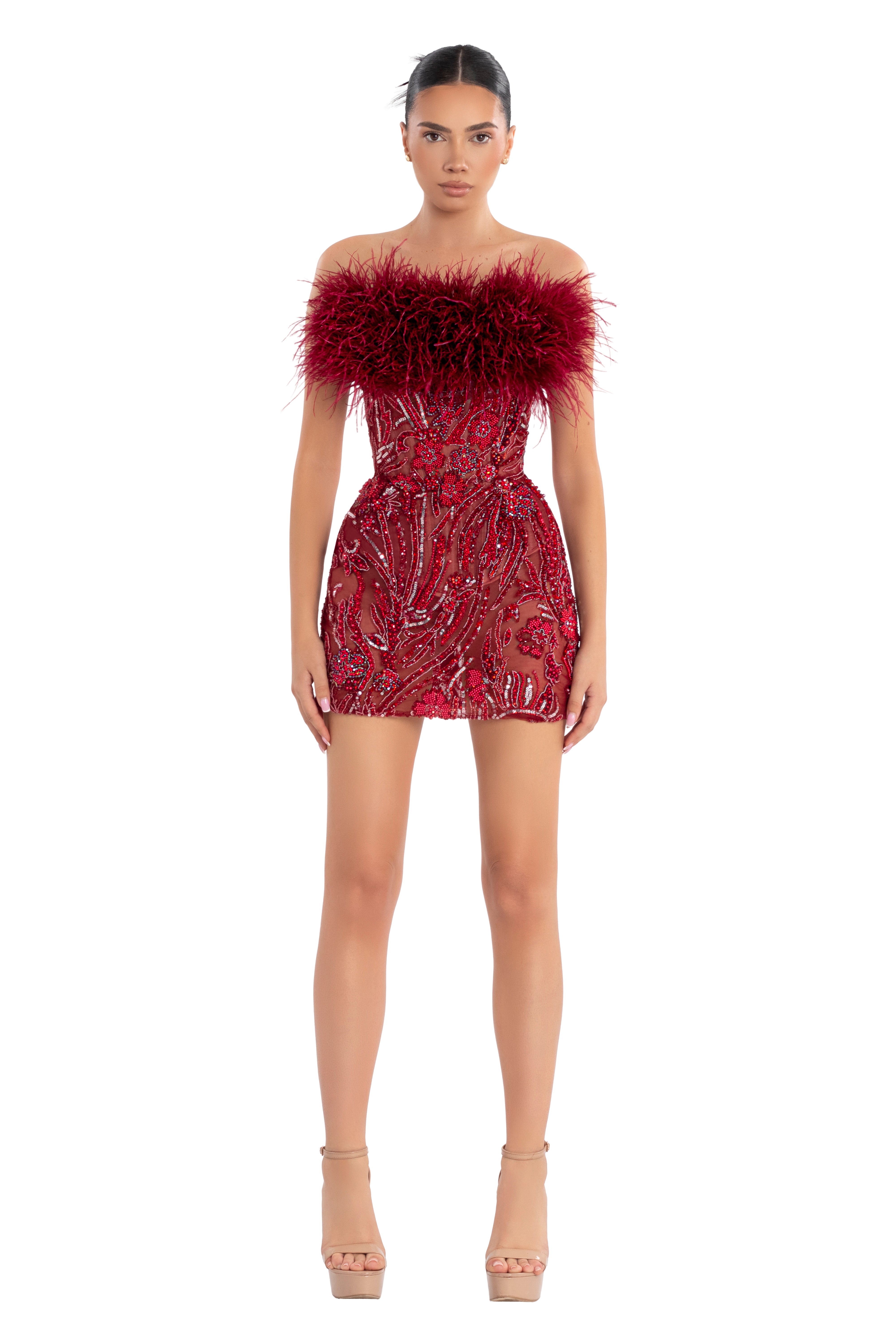 60% Sheer Mesh (Polyester), 25% Hand-Applied Embellishments (Beads, Sequins, Rhinestones), 15% Ostrich Feather Trim