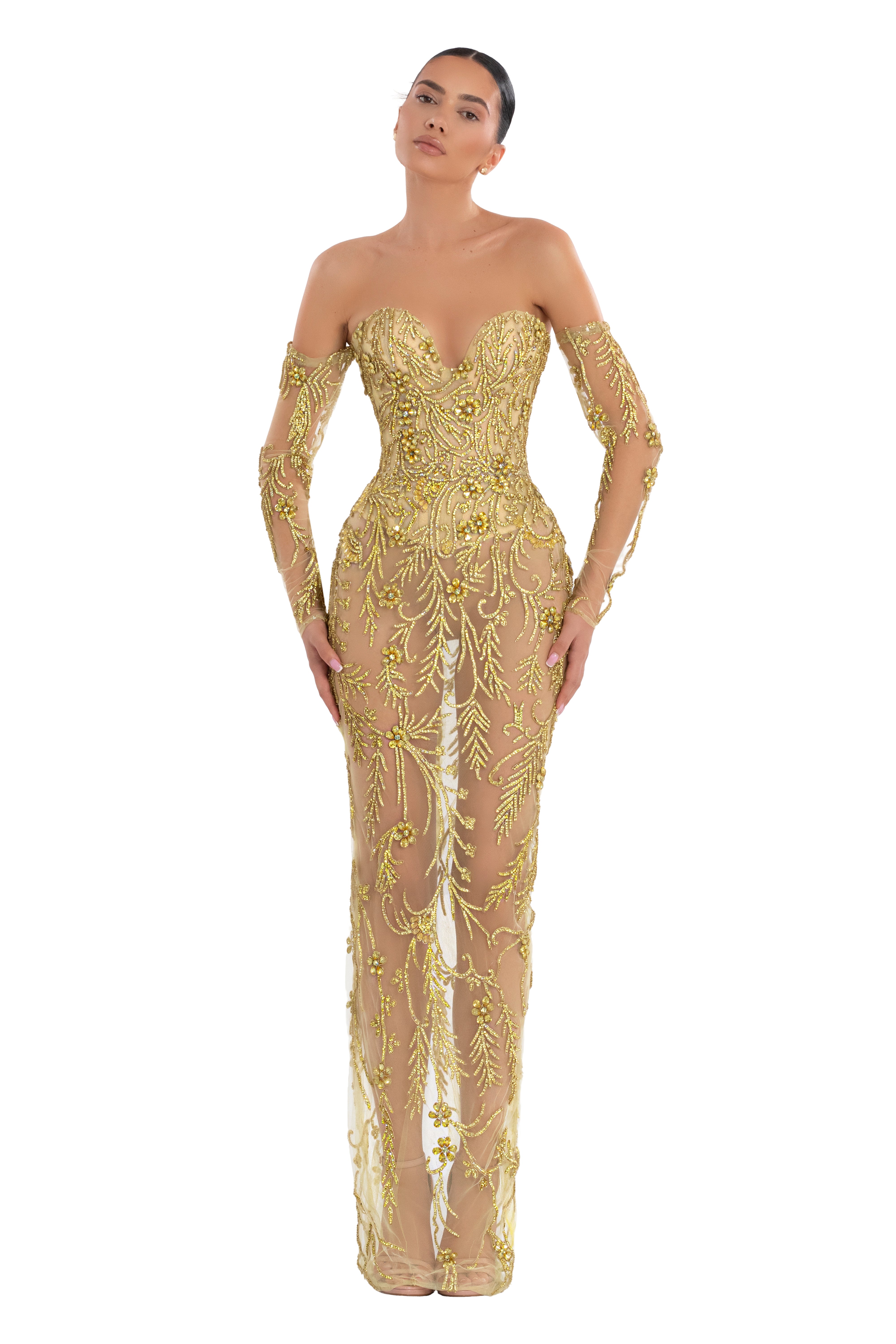 75% Sheer Mesh (Polyester), 25% Hand-Applied Embellishments (Beads, Sequins, Rhinestones)