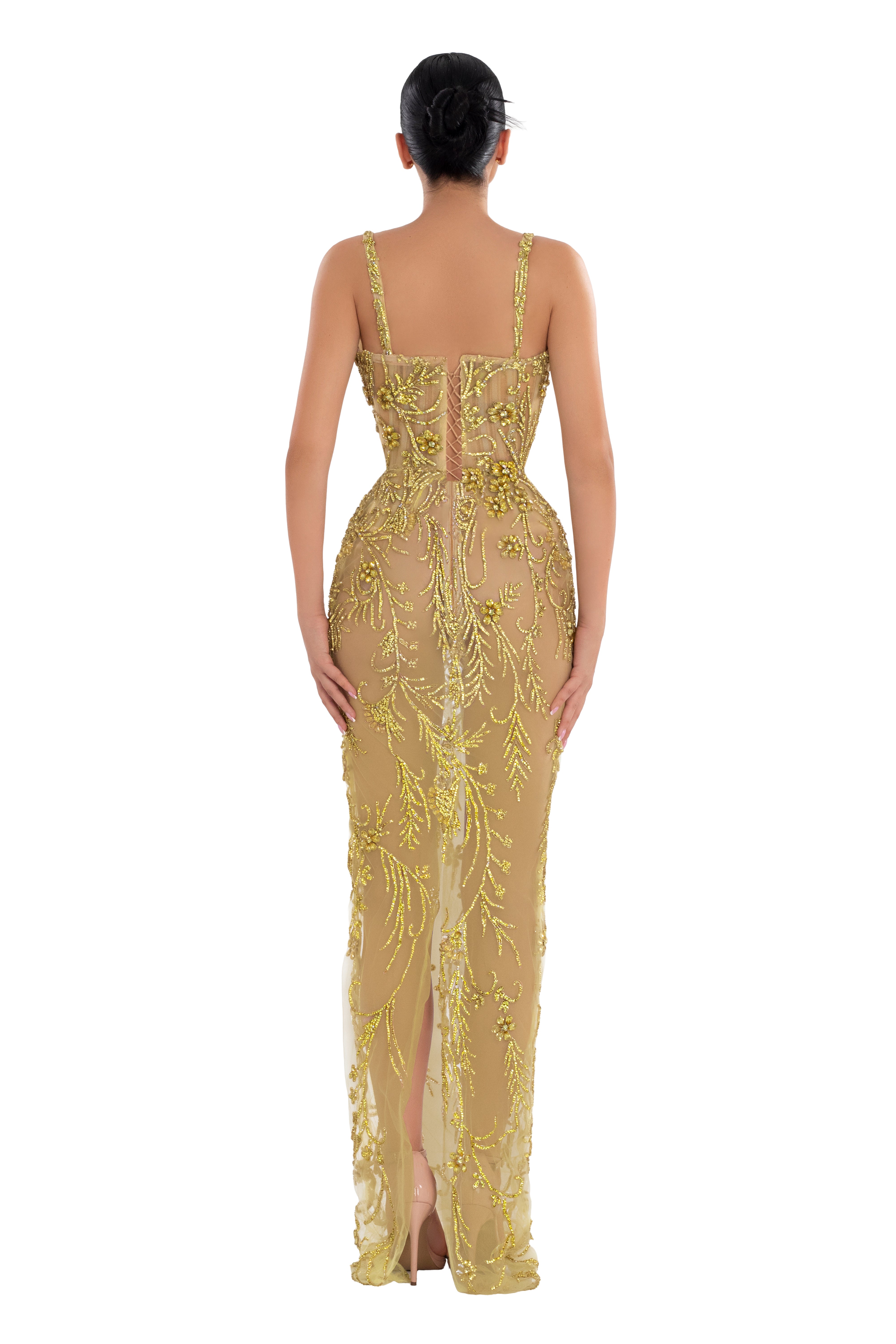 75% Sheer Mesh (Polyester), 25% Hand-Applied Embellishments (Gold Beads, Sequins, Rhinestones)