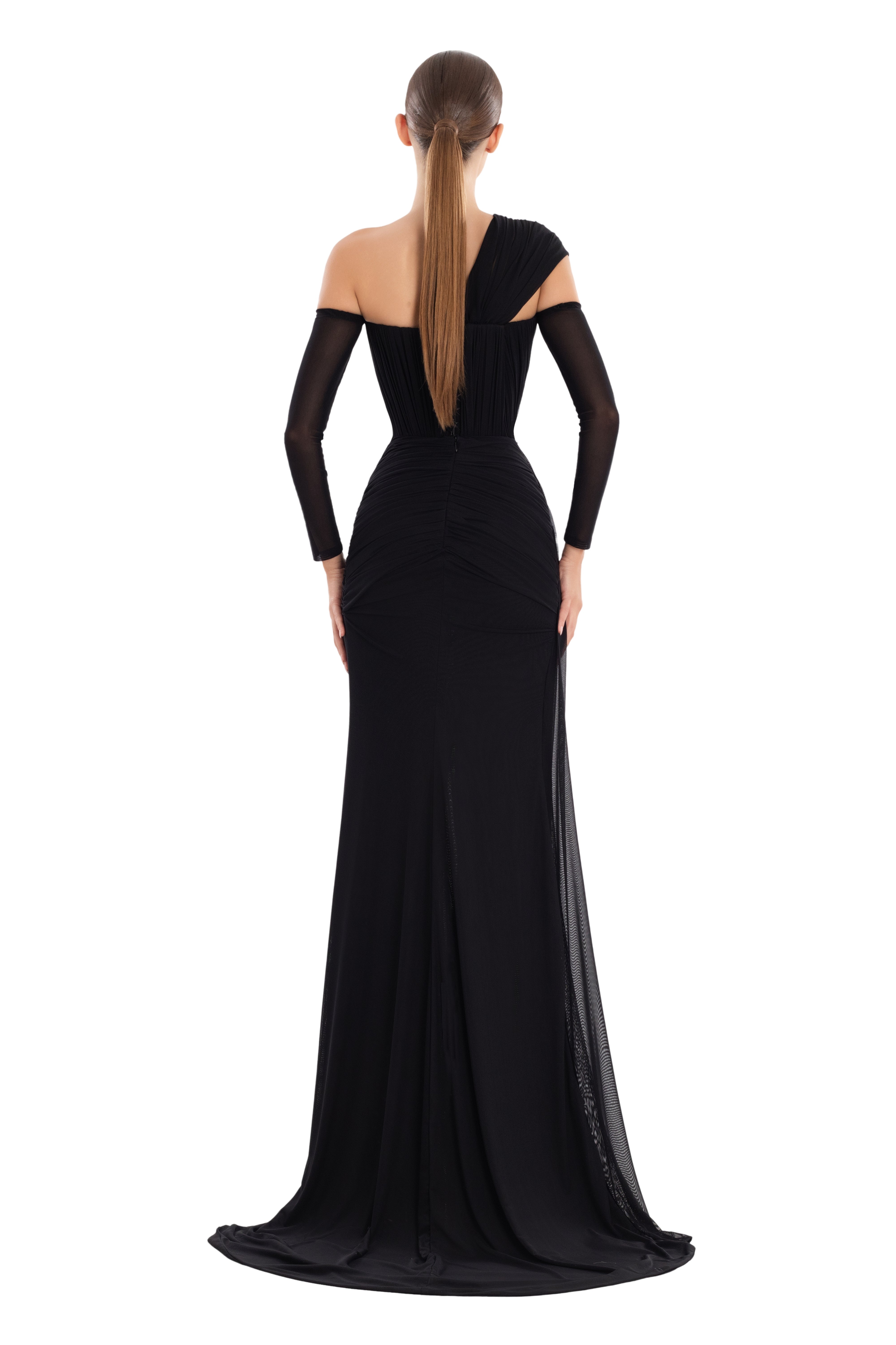 Designed with an asymmetrical neckline and a structured drape that highlights the silhouette