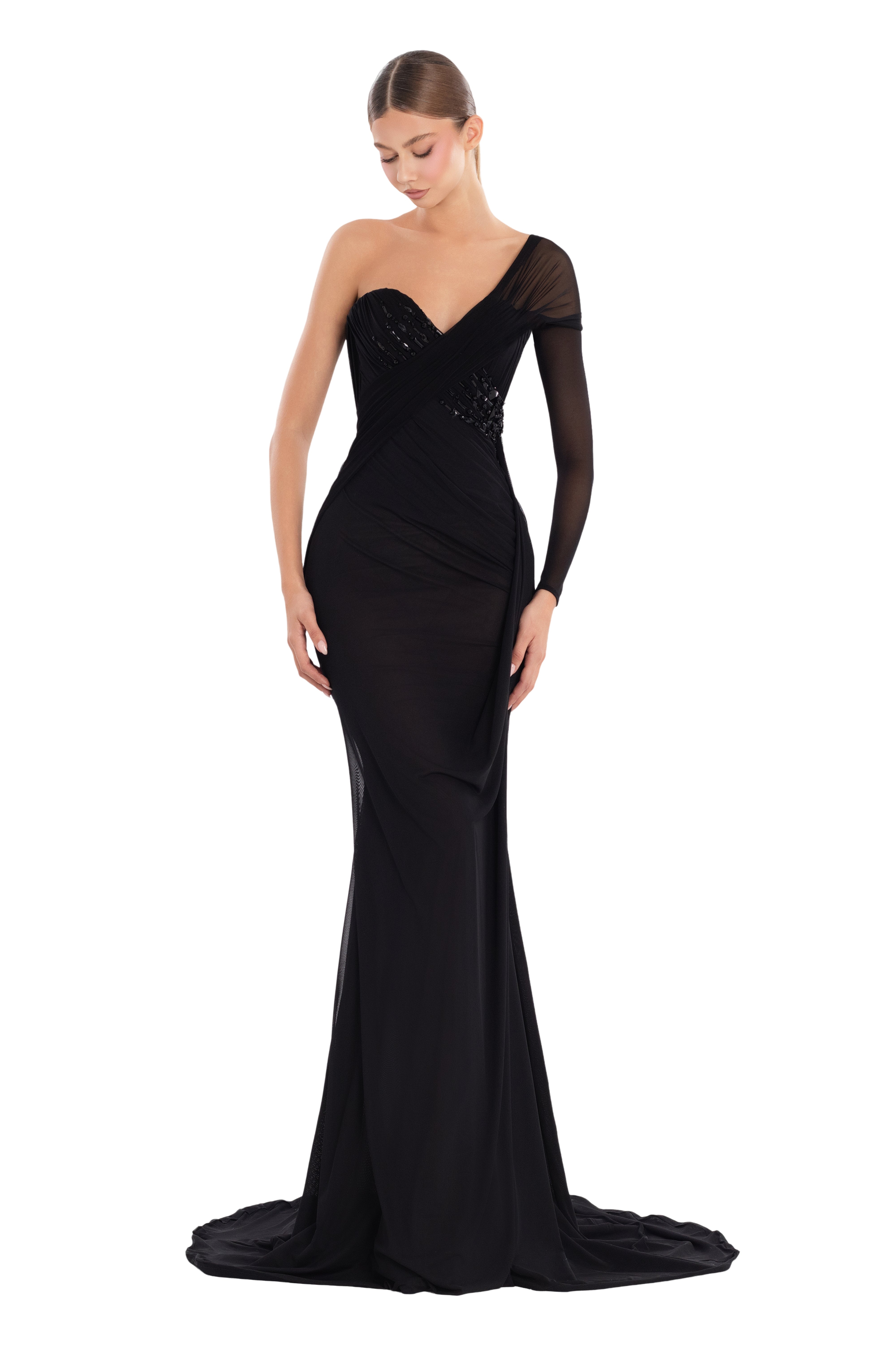 A stunning one-shoulder evening gown with an elegantly draped silhouette