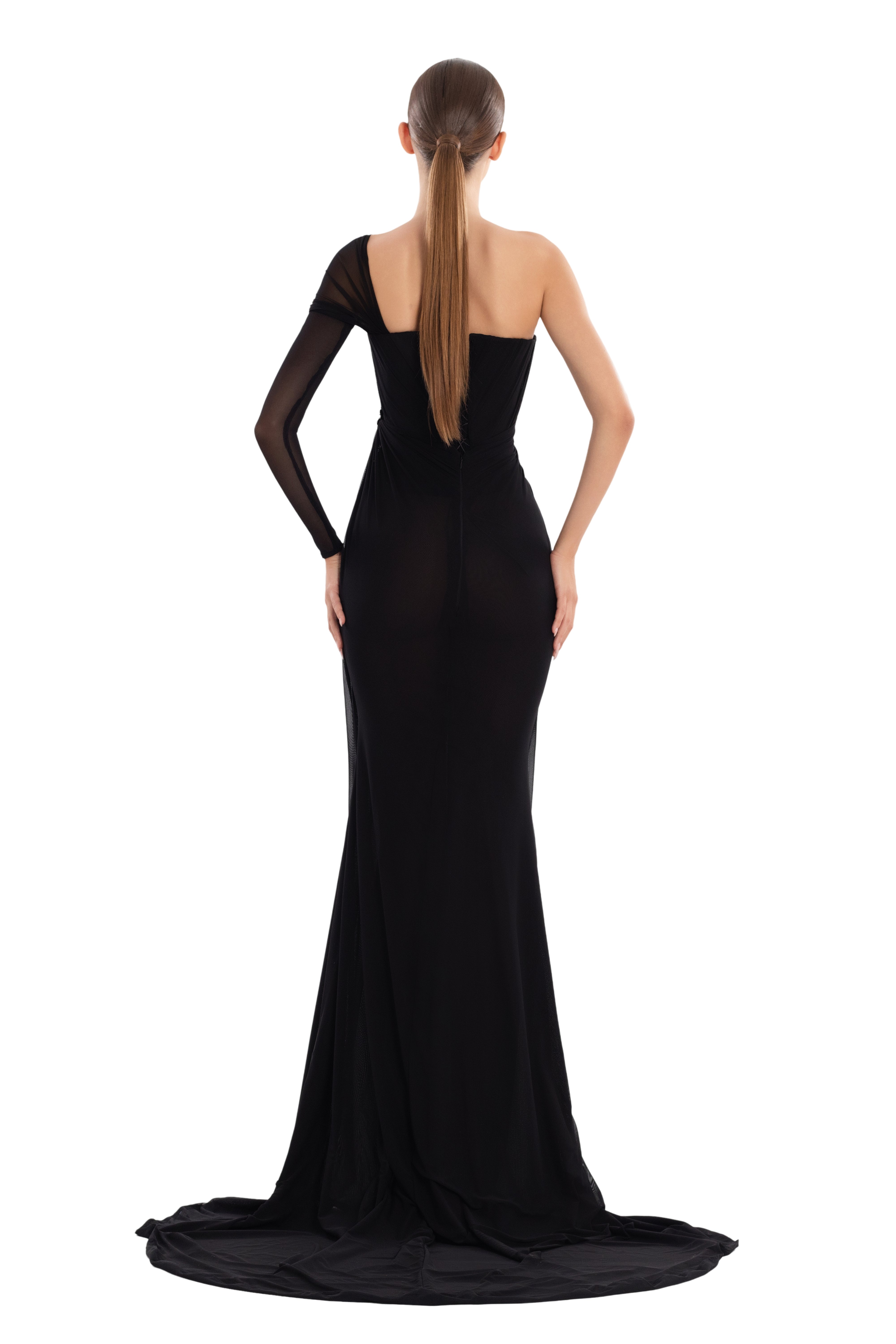 Sheer asymmetrical sleeve adds a touch of allure and sophistication