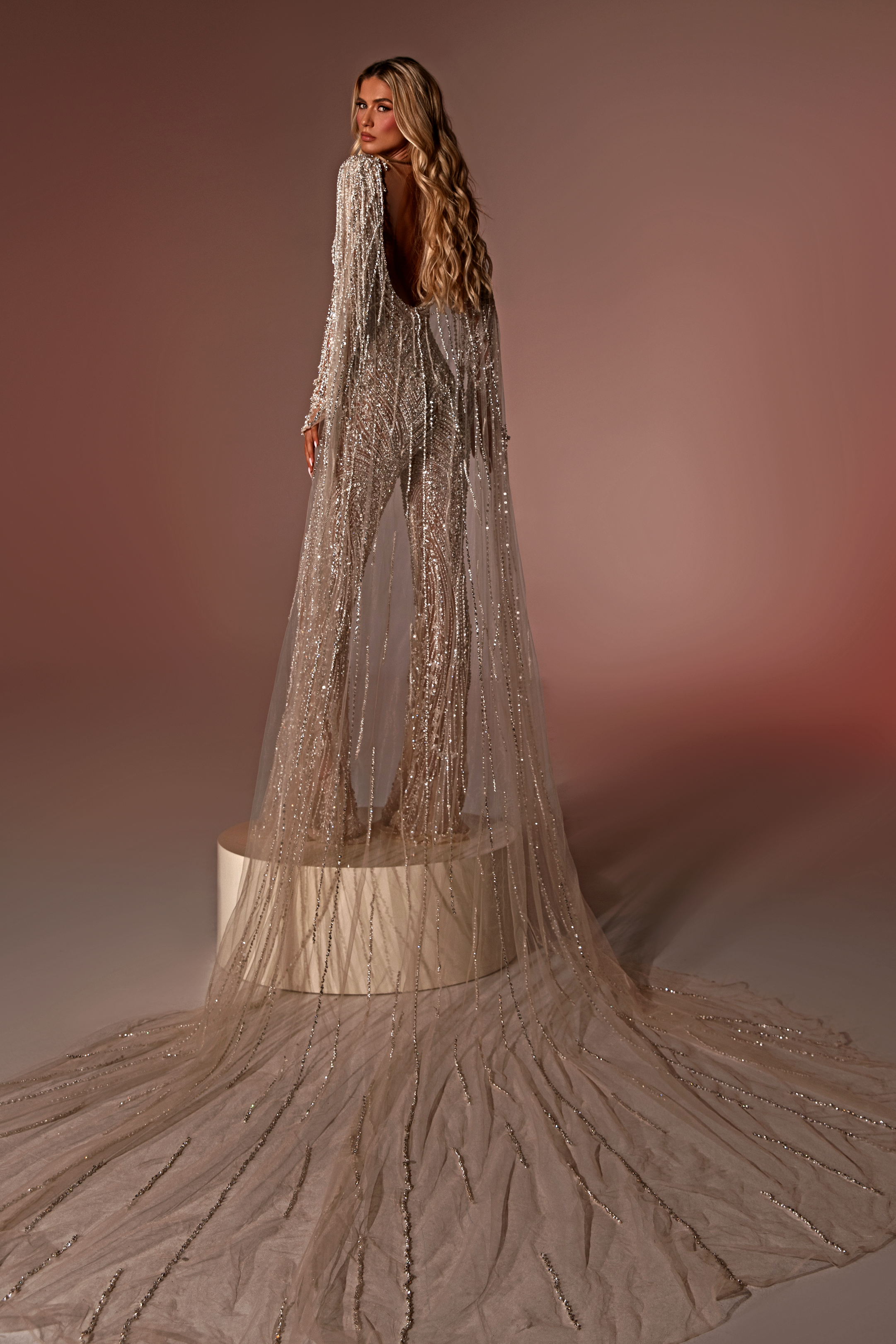Featuring a deep v neckline along with tassels, long sleeves, and pants with floor-length, adorned with crystals and stones. Bridal Jumpsuits has lace material and handmade details with fringes in front and back of the jumpsuit.