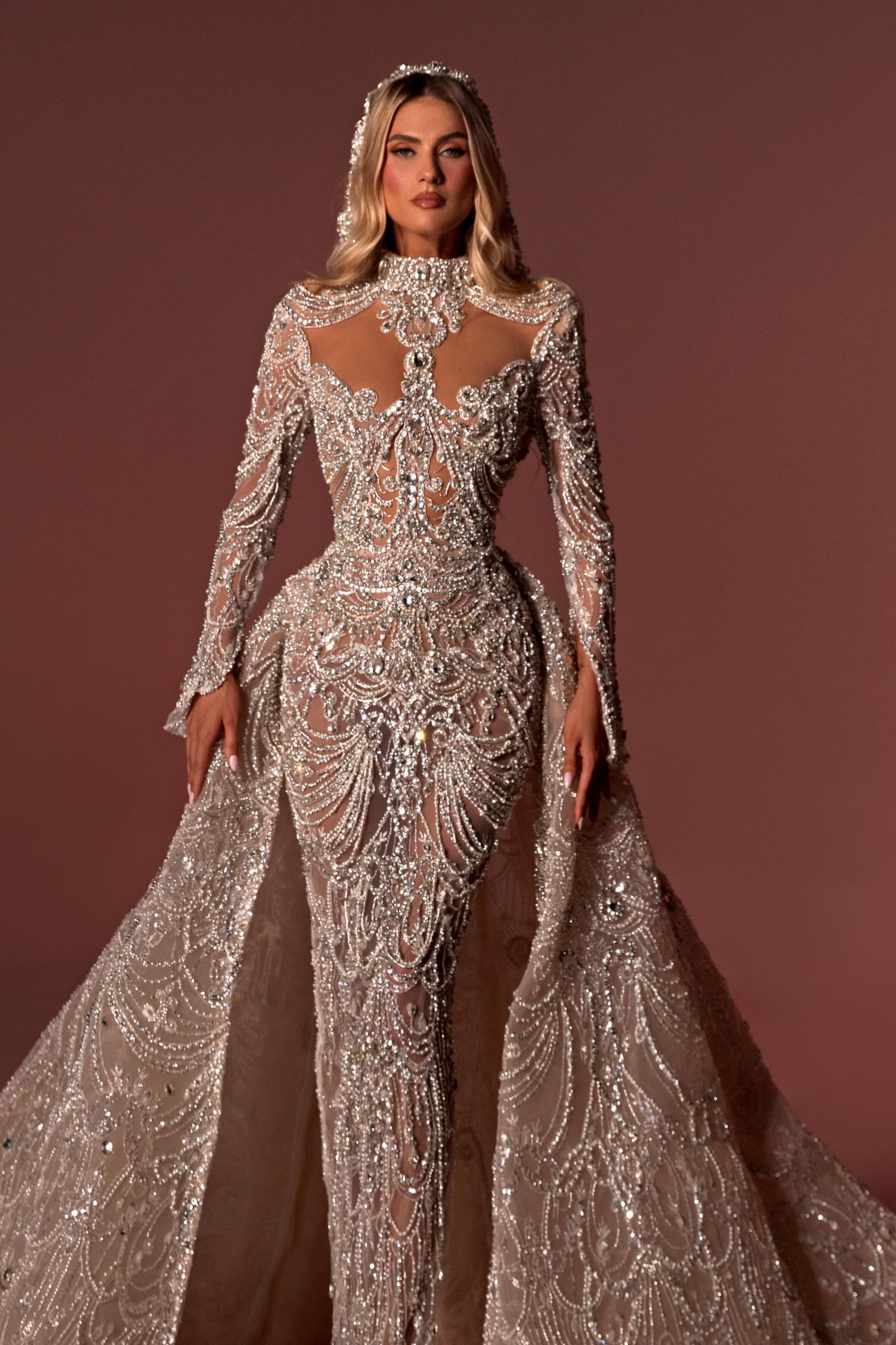 Long silver bridal Dress with high neck of bridal long dress with lace material along with crystals and stones all over it. Fitted waist and long transparency bridal dress. A long dress has a long tail behind of it.
