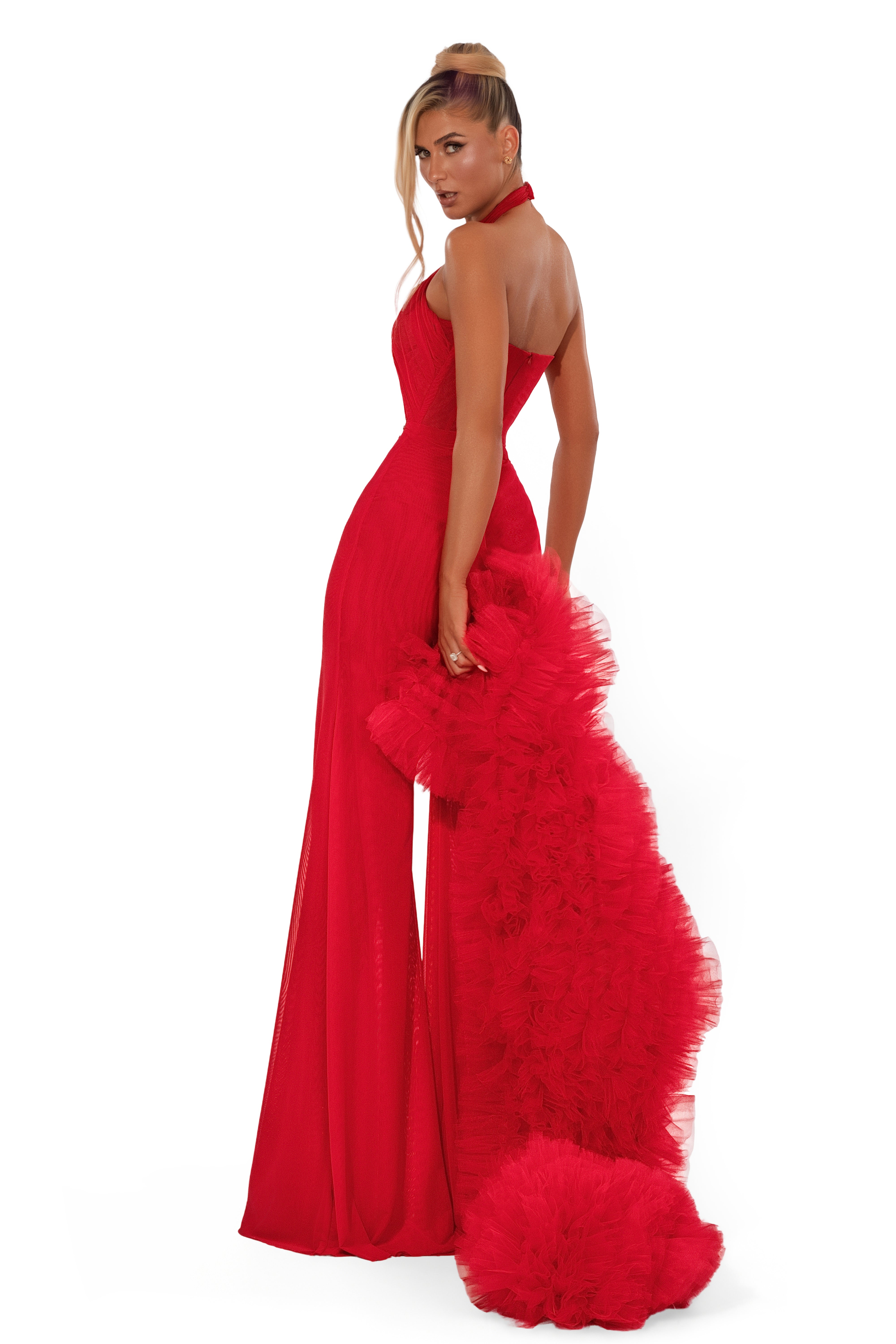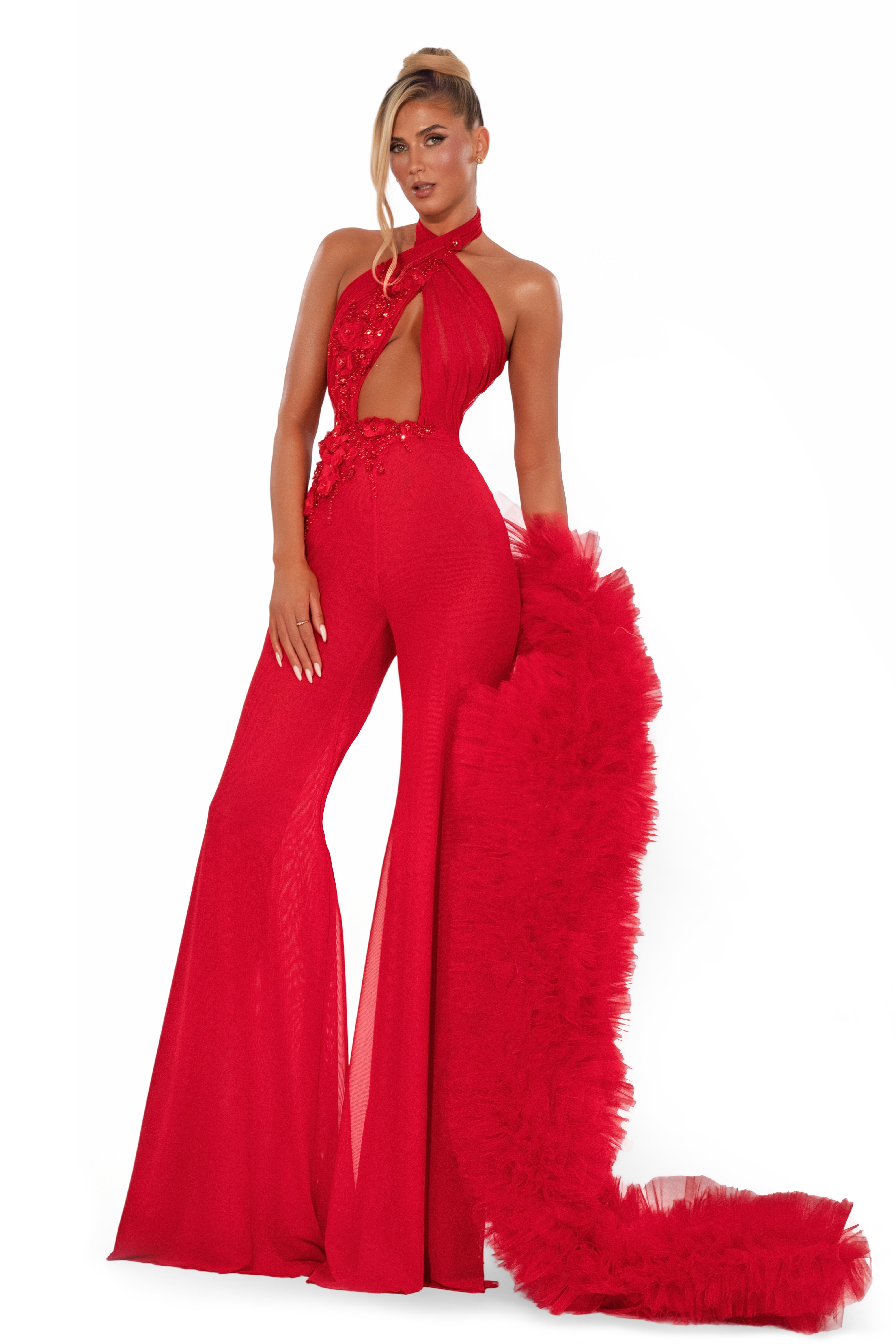 • Flared pants with dramatic ruffled train