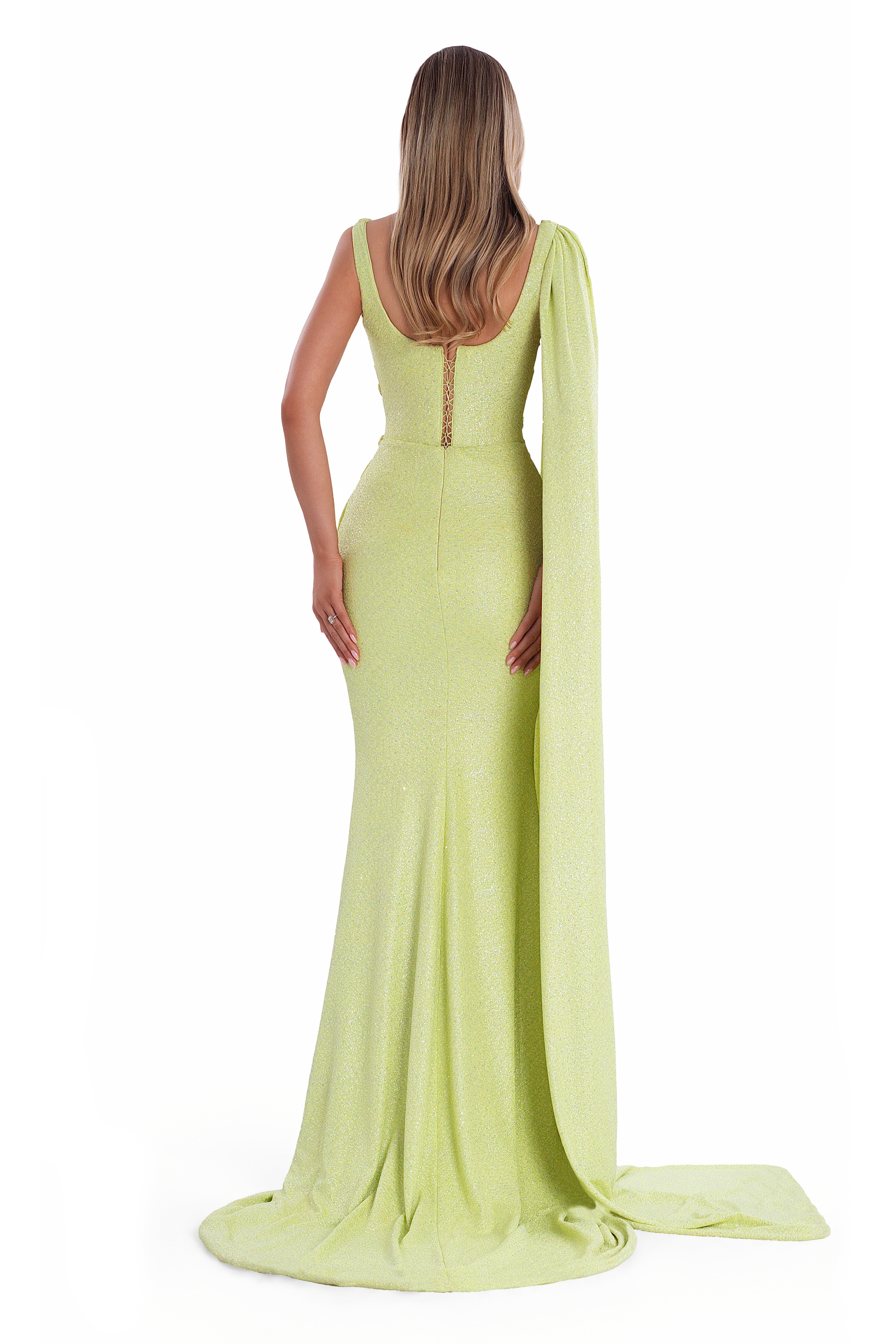 Draped one-shoulder cape for a regal touch.