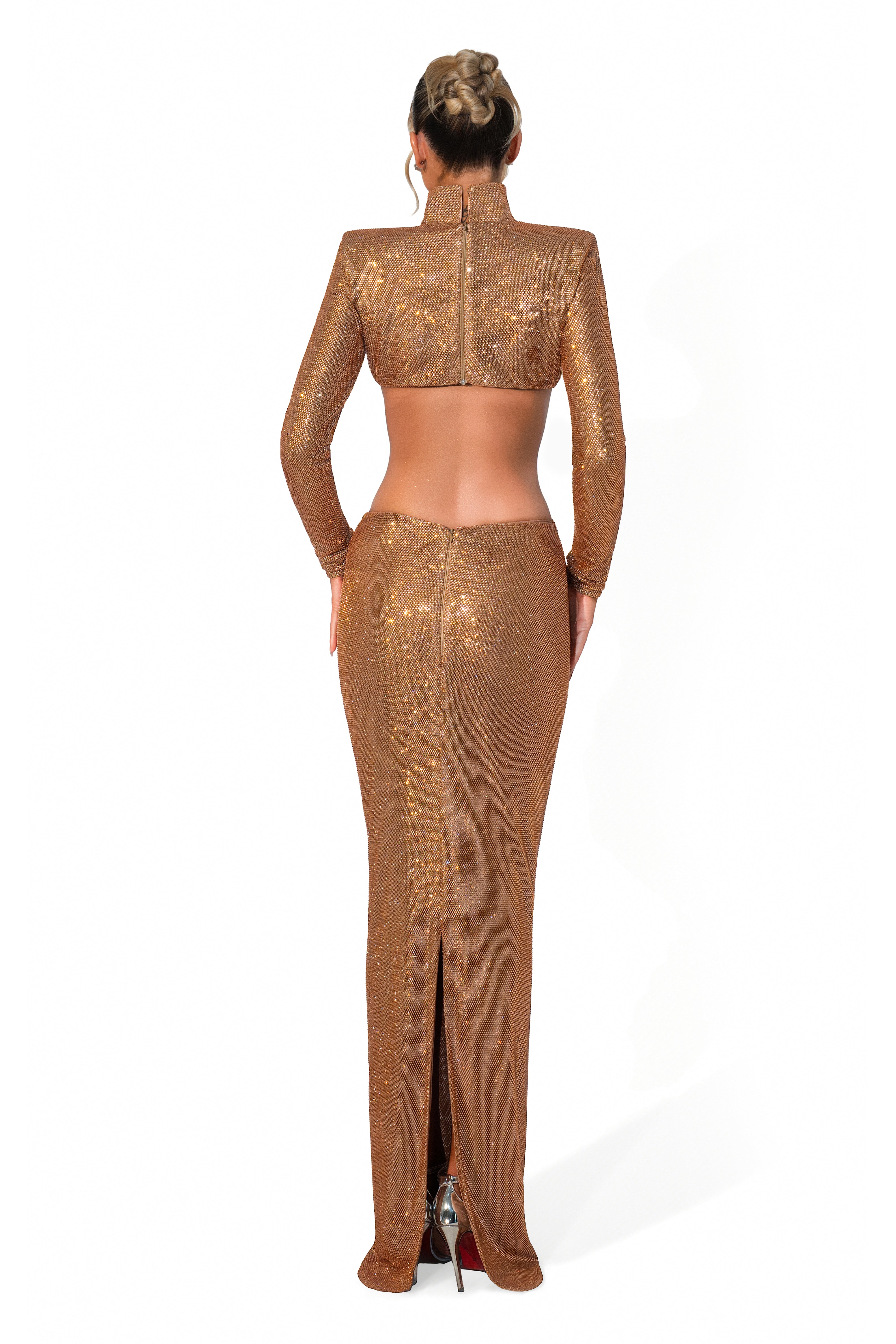 Decoration: Metallic gold fabric with waist ring details, cropped bodice, and a sleek slit skirt.