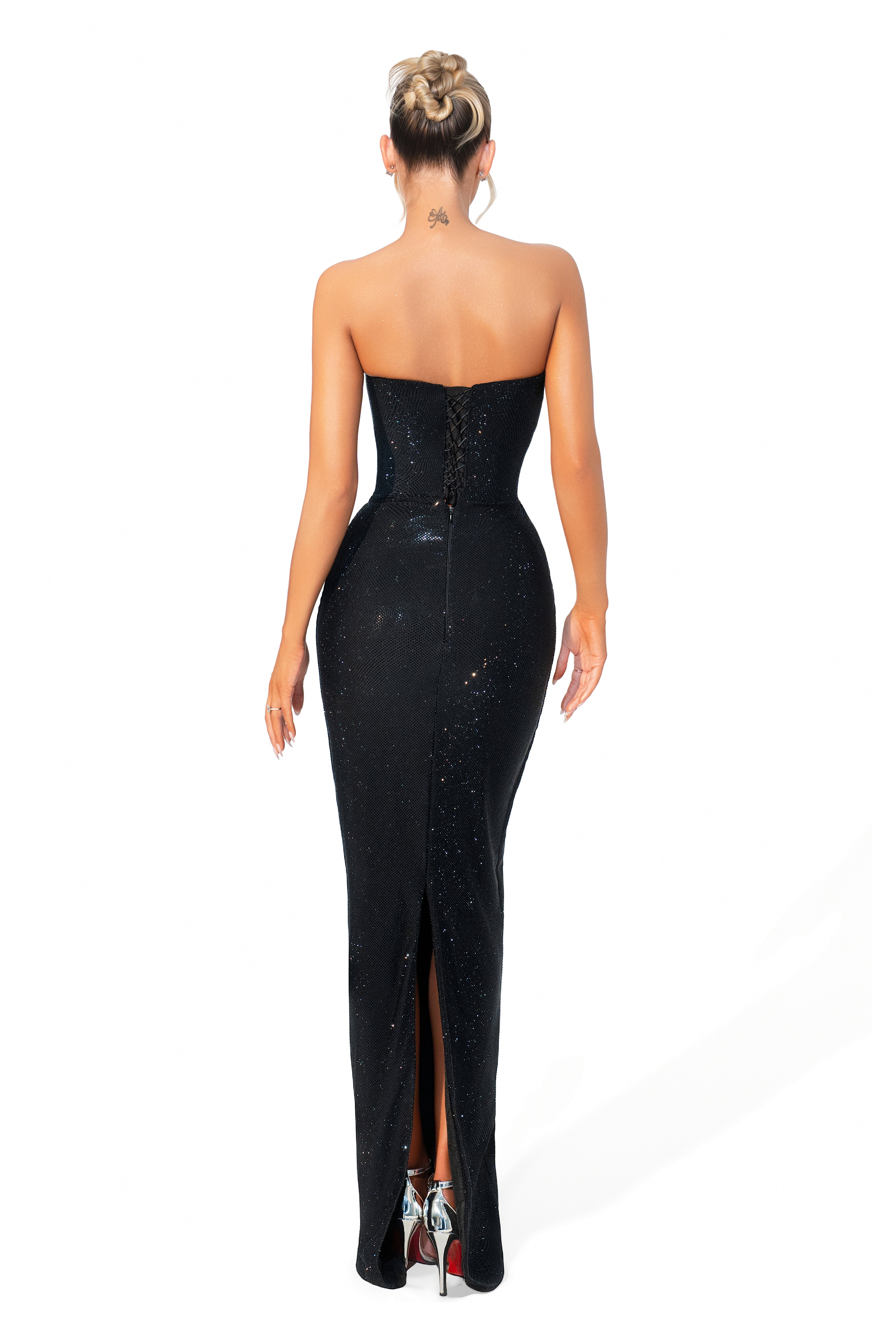 Minimalist floor-length design in deep black with subtle sparkle.