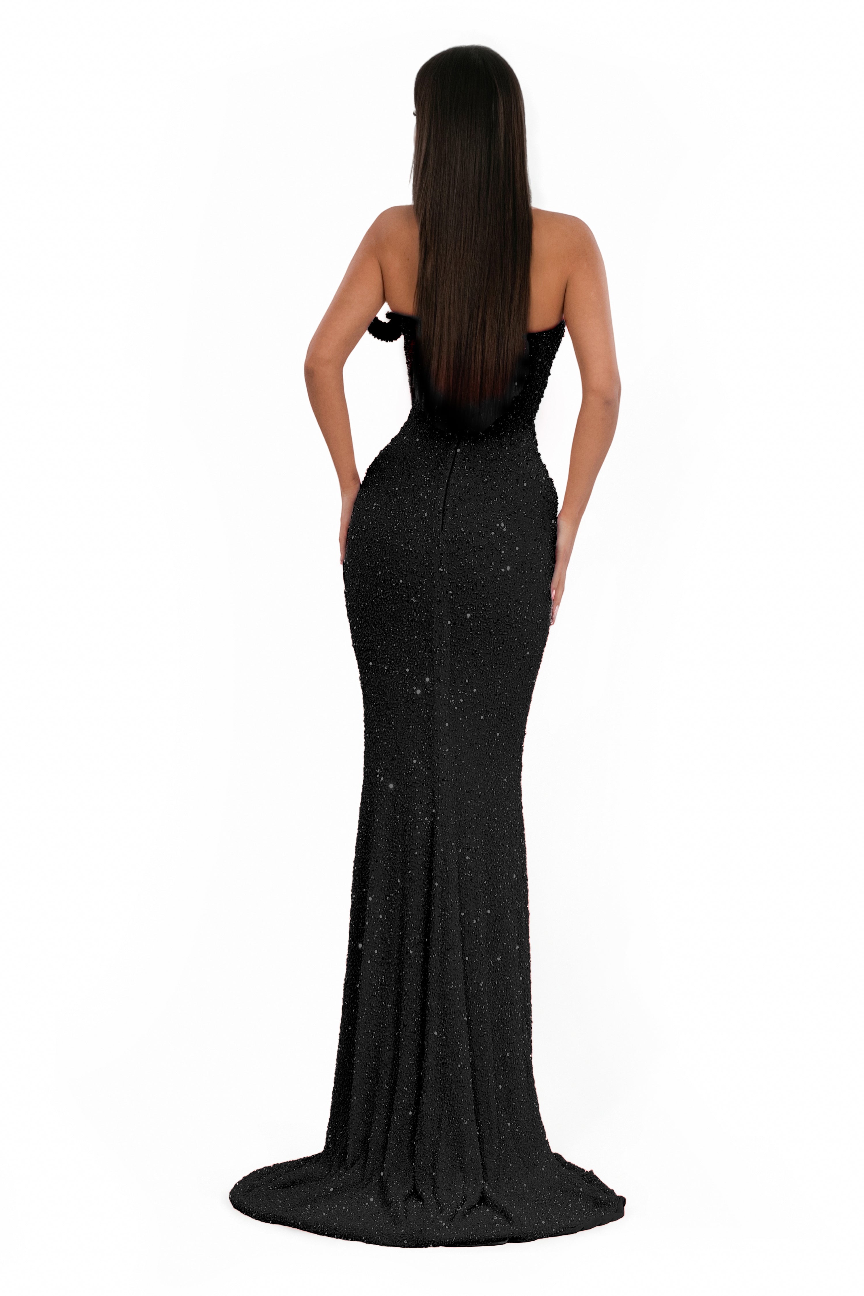 Decoration: Hand-crafted artisan bodice featuring a dramatic, asymmetrical 3D "crest" scroll across the bust, encrusted with shimmering champagne crystals and silver glass seed beads for a high-fashion, architectural finish.