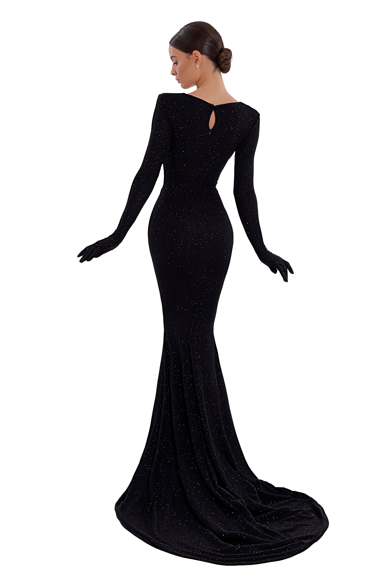 Long black dress with elbow gloves and V-neckline in front of the chest and the back is slightly open