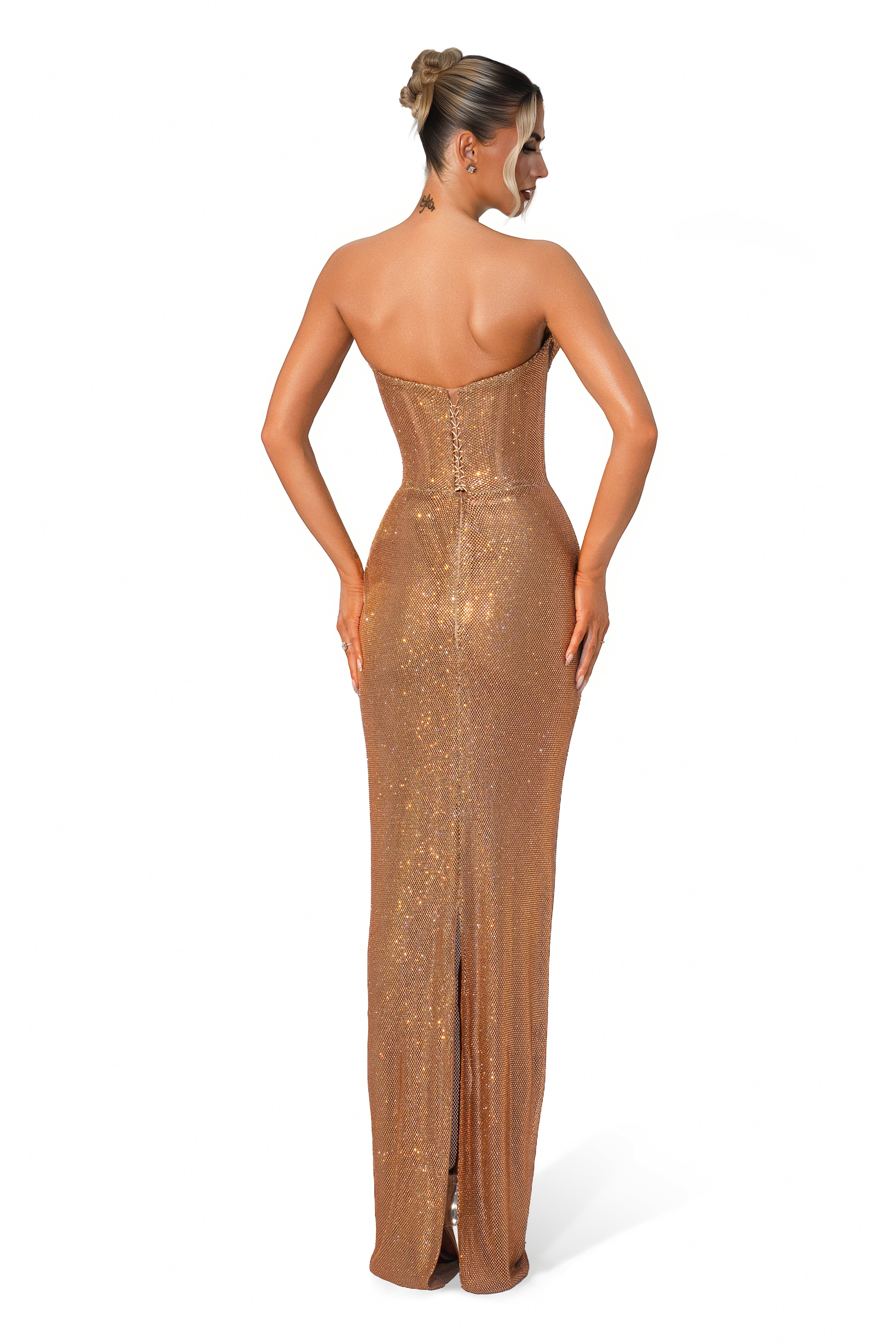 Decoration: Glittering gold fabric with sweetheart neckline, front keyhole cut-out, and elegant back slit.