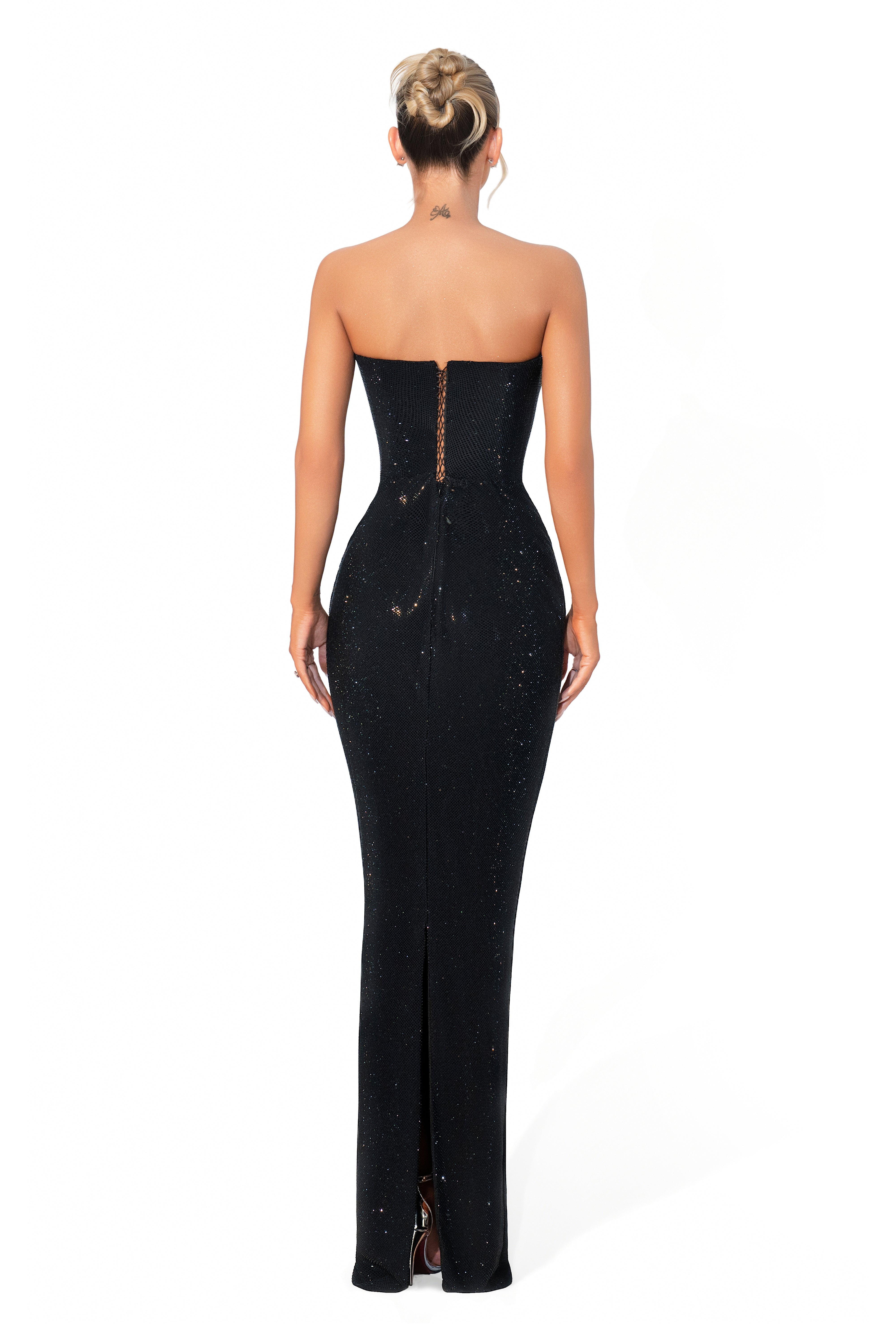Decoration:  Black sequin fabric with keyhole cut-out and central ring detail, finished with a back slit.