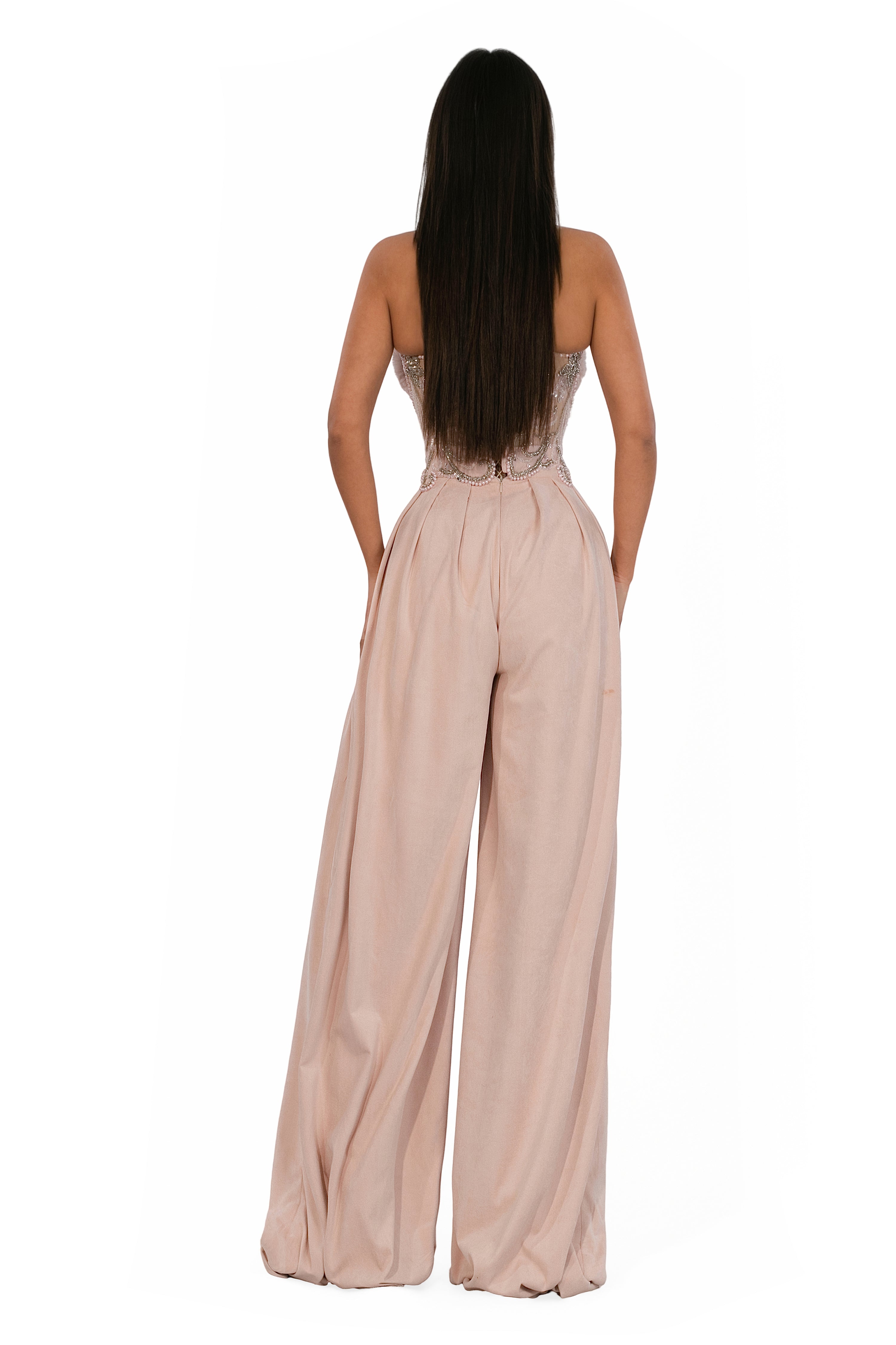 Decoration: Hand-crafted artisan bodice featuring plush faux-fur textured accents along a deep sweetheart neckline, detailed with central crystal starburst embroidery and delicate glass seed beading.