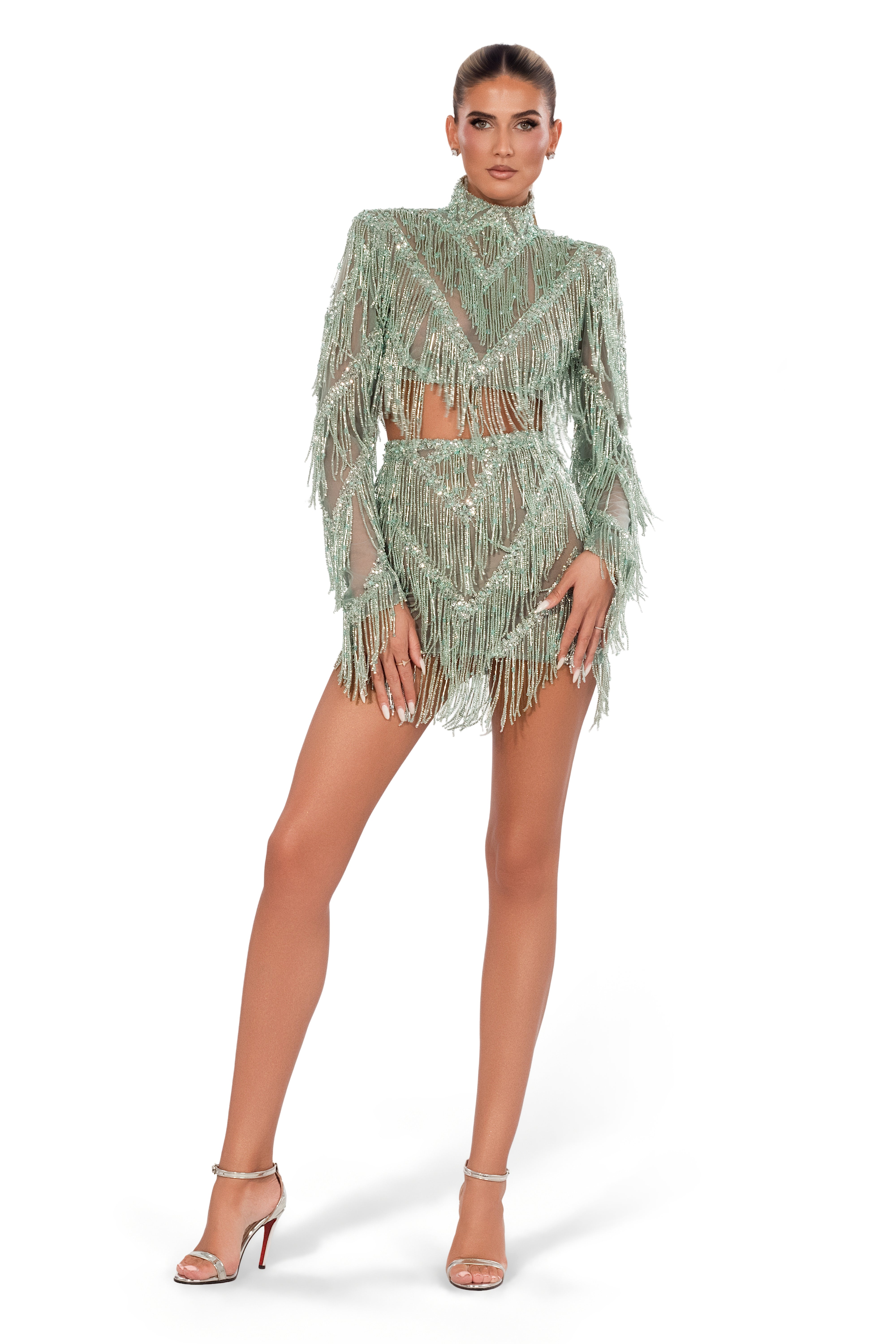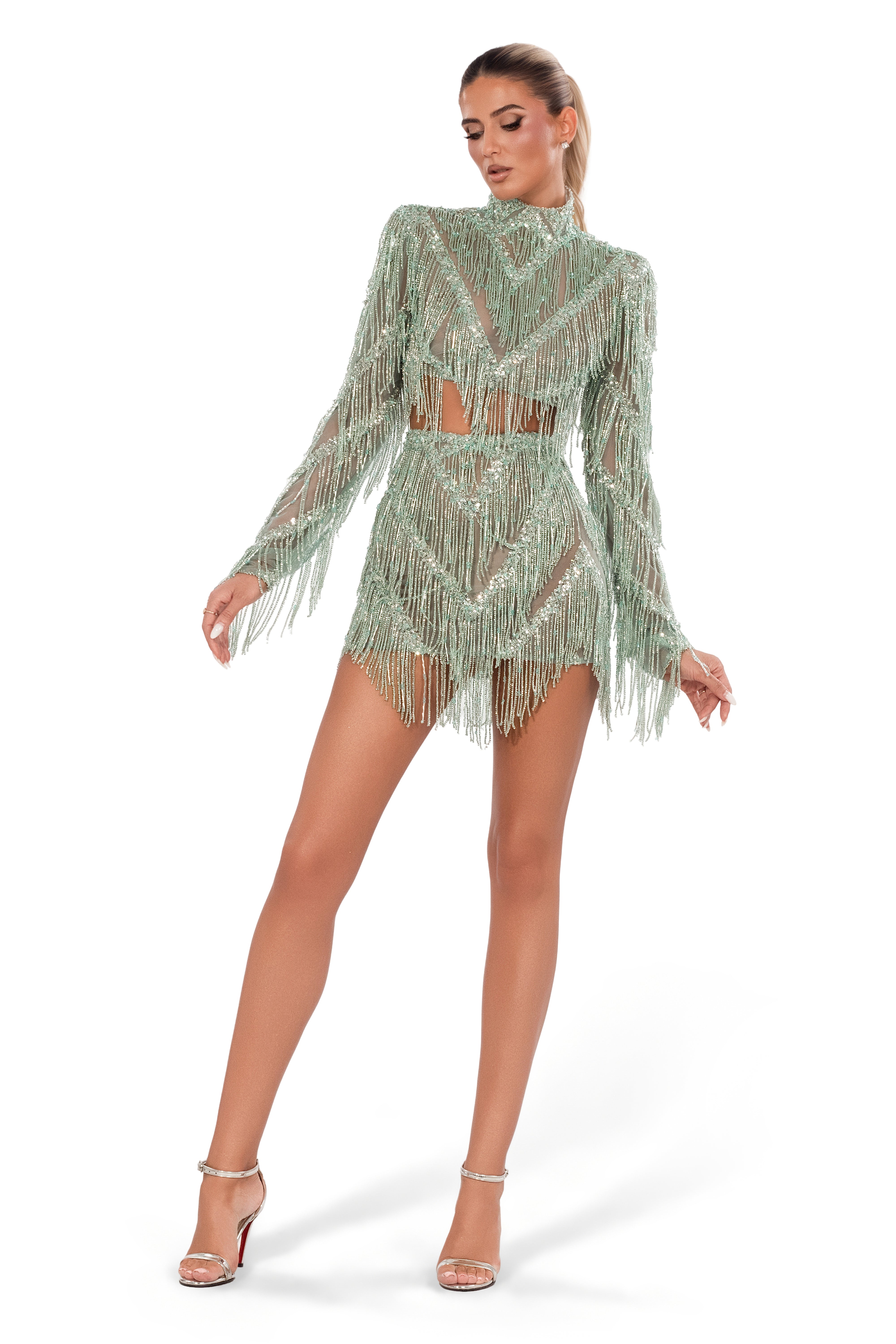 DECORATION: Machine-embroidered embellishments with linear beading fringes