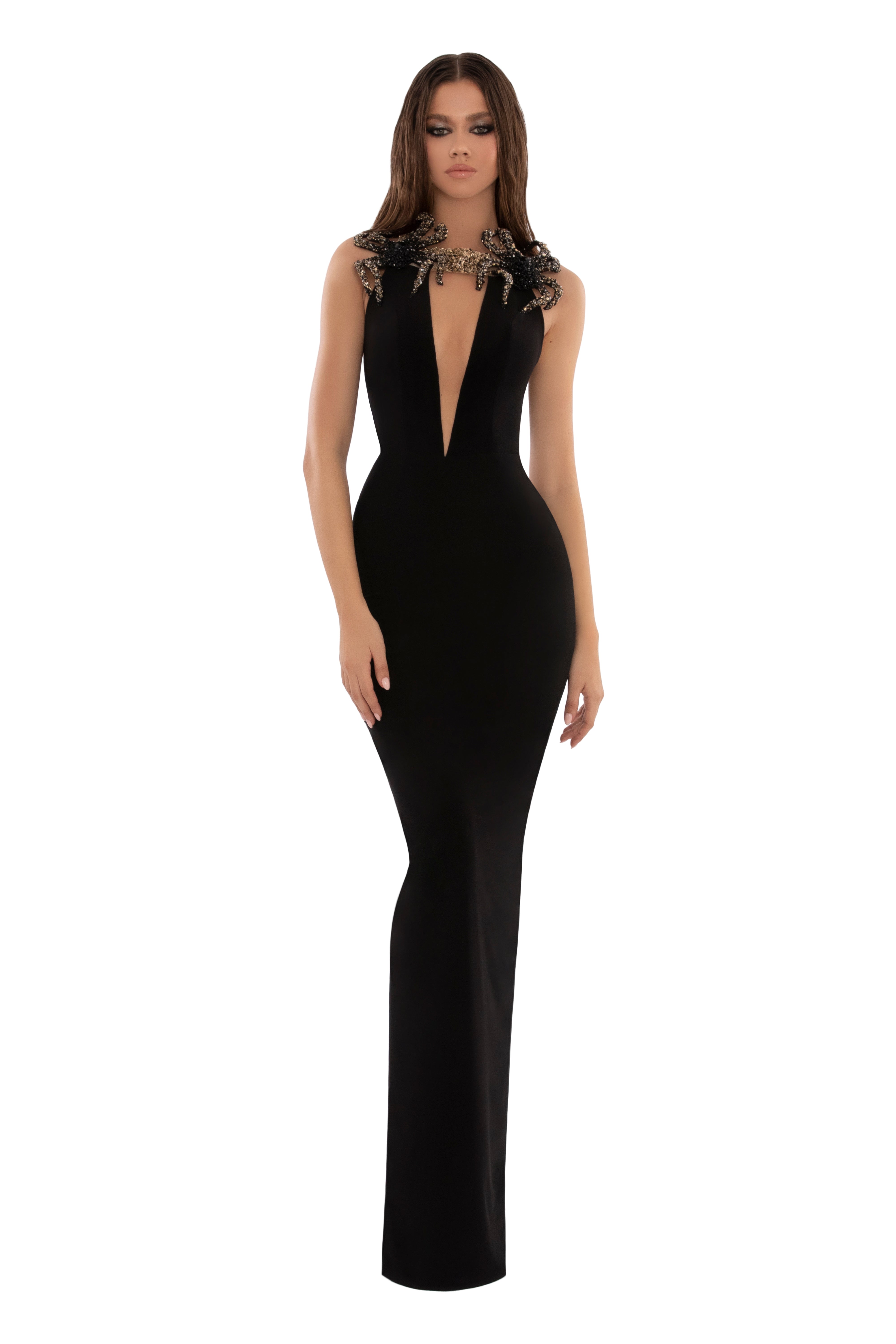 The model’s height: 180/ 70.0, bust: 91 cm/ 35.8, waist: 60 cm/23.6, hips: 101 cm / 37.5.
